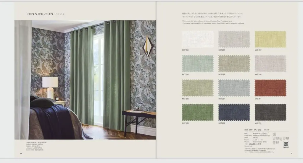 サンゲツのモリス・クロニクルズ・デジタルカタログなんかを見ると分かるのですが、床材を天然突板張りの幅が広いものを使っていたり、ヘリンボーン折りにして英国風にしています。そして壁紙の下の巾木(はばき)も輸入だったり少し装飾があるものにしています。