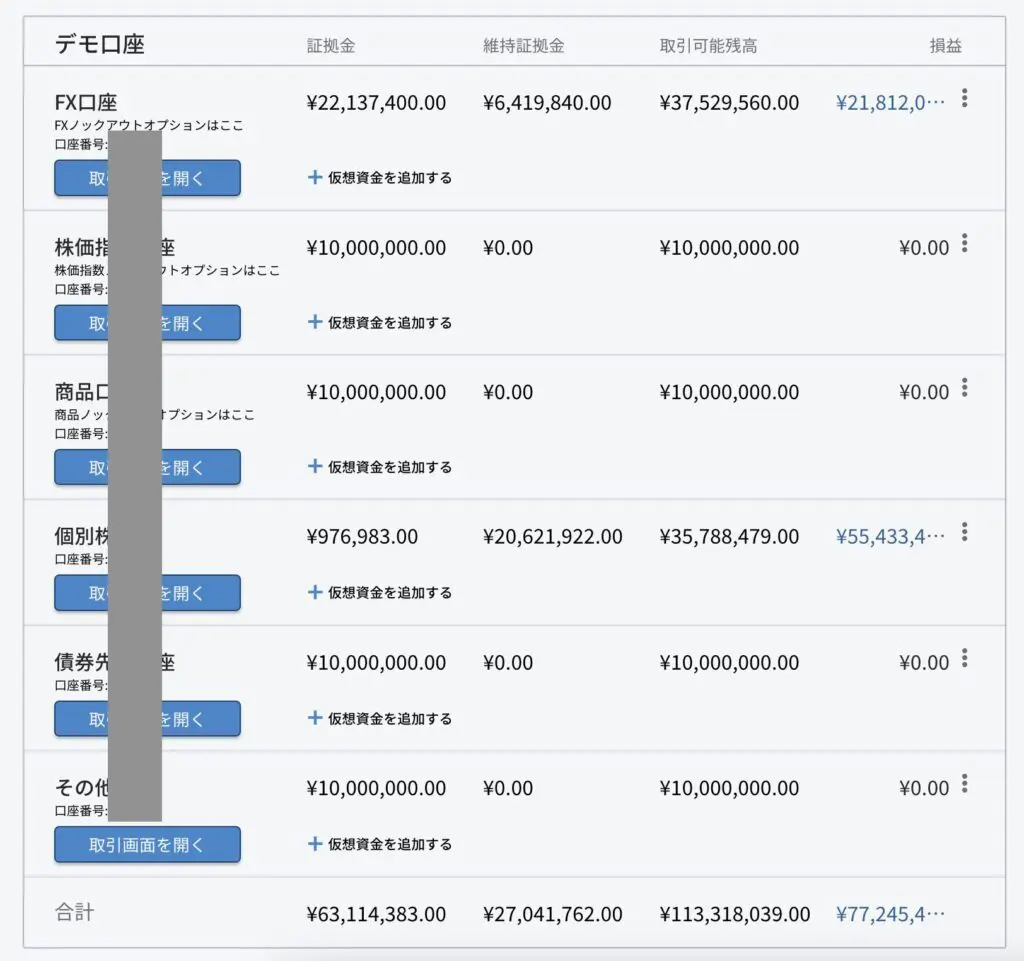 ちなみに私はIG証券を使う前に、自分のカンが信用できずに、 1年ほどはデモ口座でトレーニングを積むことにしました。各口座にはもともと資金が1000万円ずつ入っているのですが、 なんと現在の利益は7700万円まで到達しました。