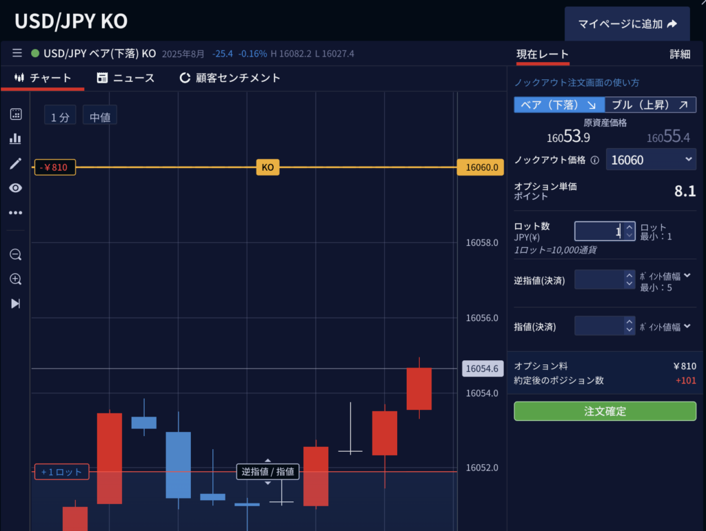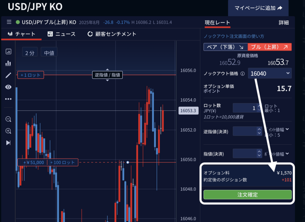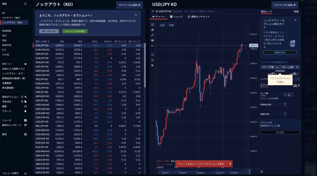 これは実際と同じ取引画面ですが、左からFXやバイナリーではなく、ノックアウトと書いてある部分をクリックします。すると、右側に「上昇」か「下落」を選ぶボタンがあり、 その後に最低ロット数とオプションの幅を選択することができます。