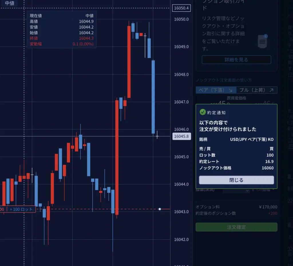 ちなみに素人の場合、チョコチョコ買って売って繰り返しても、まず大きく勝つことは難しいと思います。 私も偶然、このノックアウトオプションで何万円か利益を出していたとき、どんどん気が大きくなり、一回で張るロット数を上げてしまいました。