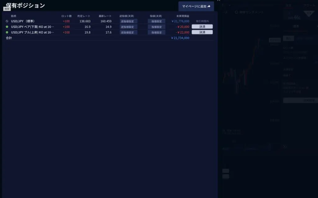 この場合、158円にノックアウトのラインが敷かれて、もし予想外に158円以下に下落してしまった場合は、そこで強制的に決算することになります。事前に右側に損失する最大の金額が表示されているので、 これ以上大きな損失を被ることはありません。