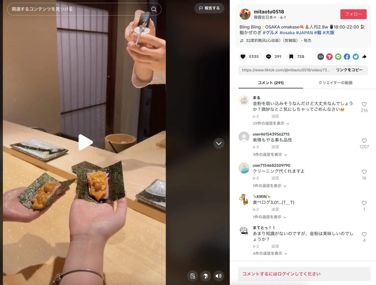 一部では、「金粉を吸い込むと体に害がある」などありますが、 見ている感じでは、指先と寿司、カウンターにかかっているだけで、 お客さんへの害は少なそうです。