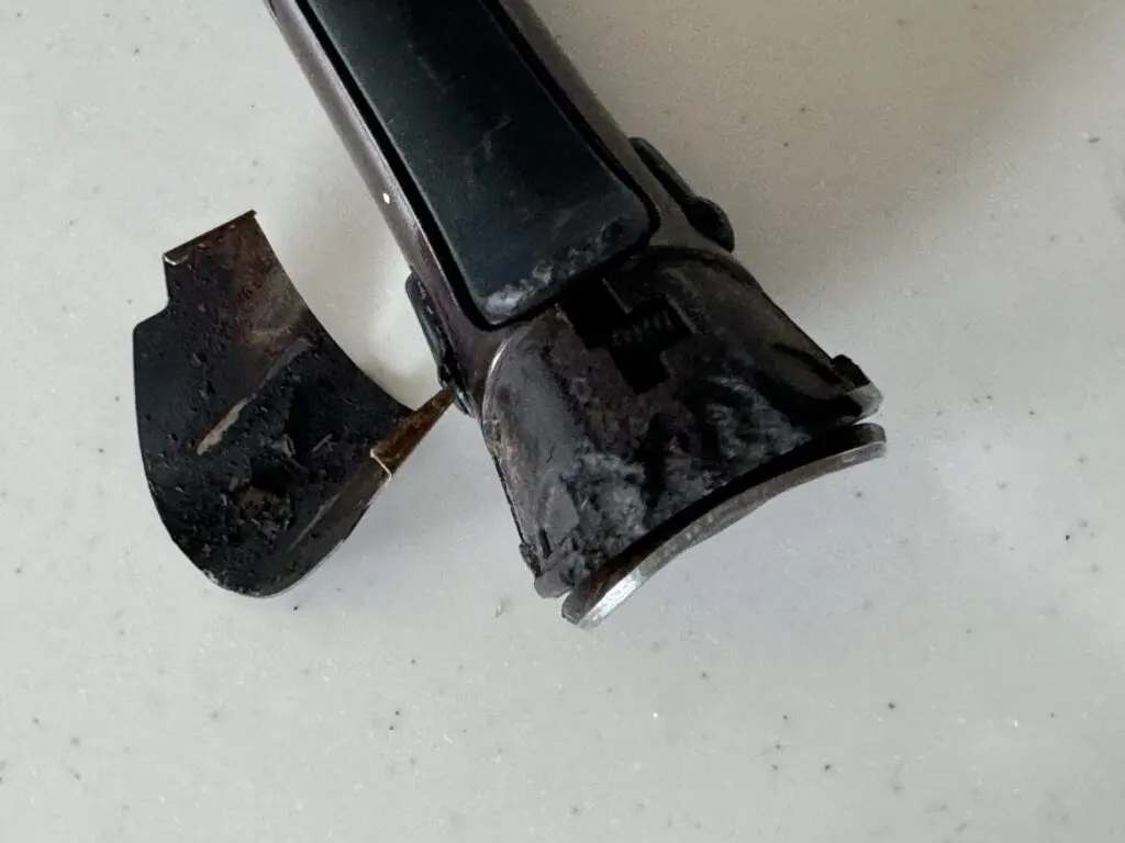 最近5年ぶりに再び使い出したのですが、取っ手のシルバーのカバーの部分は異常がないのですが、 外せなくなり、力で無理やり外すと、内側が熱で溶けています。