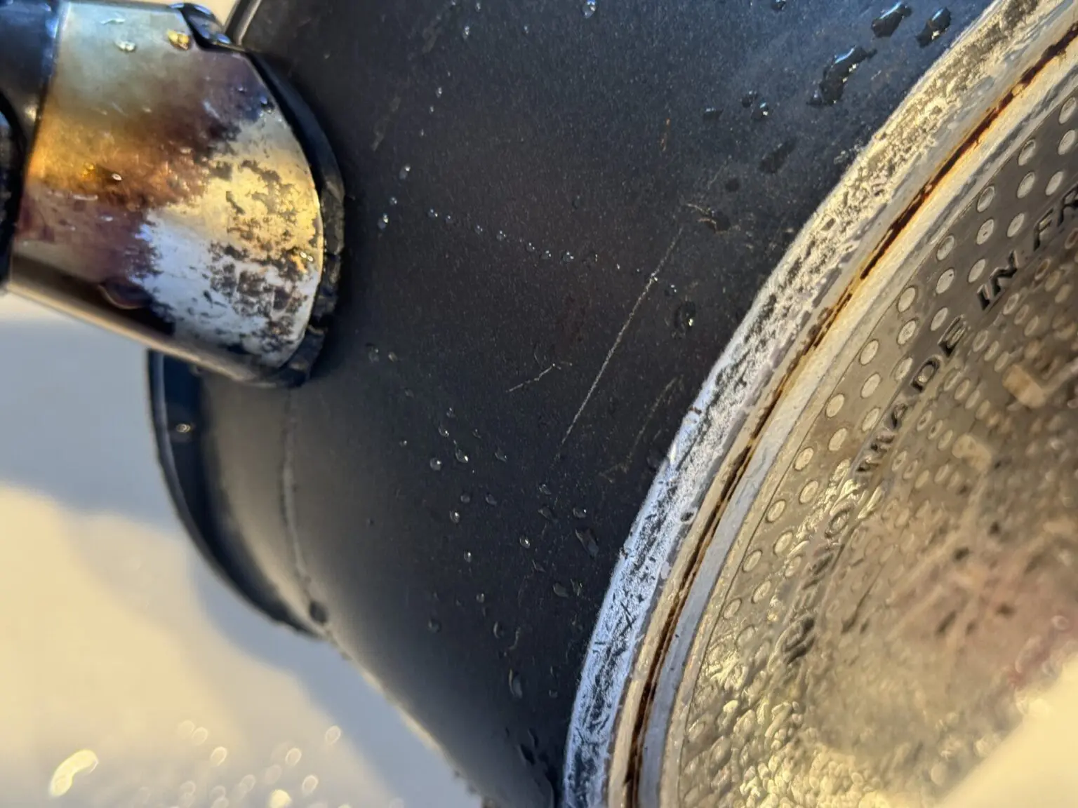 プラスチックの部分がボロボロに外れてくるので、やはり経年劣化と熱による劣化なのではないでしょうか。本体の部分に接続しているので、どうしてもこの部分は高温になりやすいですし、コンロの火が直接当たりやすいです。