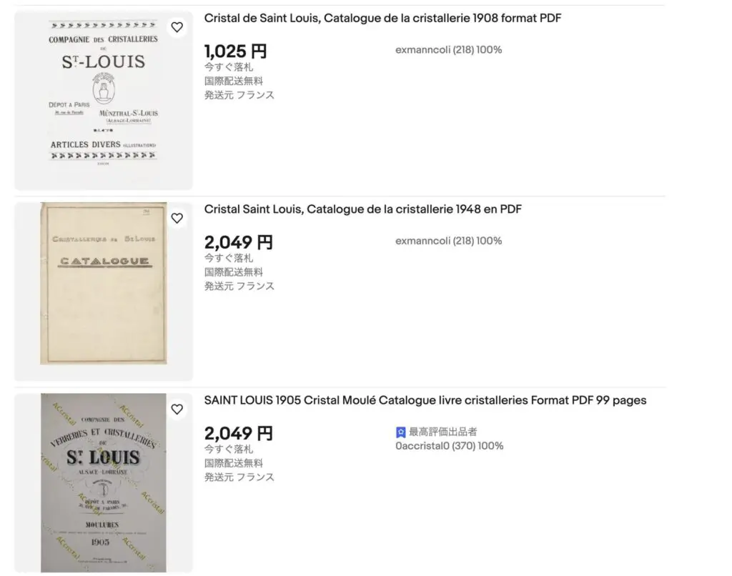 例えば「saint louis crystal catalog」などと、ブランド名+カタログで検索すると、1900年代のものが大量にPDFで出てきます。著作権が切れていると考えているためか、こうしたカタログはPDF形式で一般販売されています。