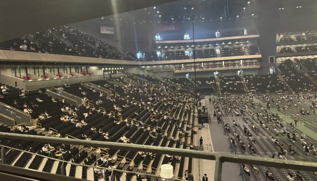アリーナは以下のようで、中央はパイプ椅子が並べられていて、後ろの方は座席が用意されています。 左右は、オペラハウスのように何段にもなっています。