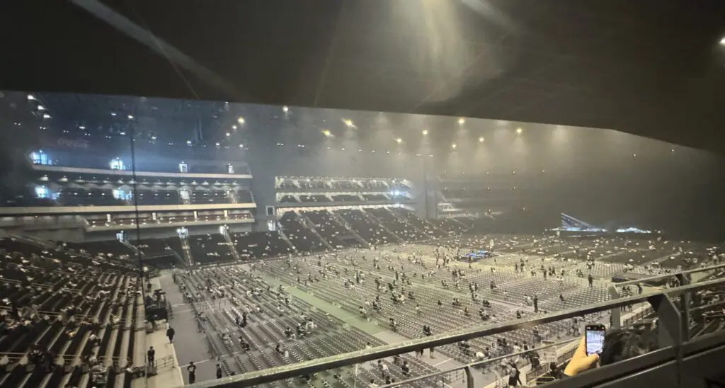 アリーナは以下のようで、中央はパイプ椅子が並べられていて、後ろの方は座席が用意されています。 左右は、オペラハウスのように何段にもなっています。