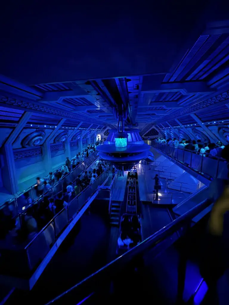 中は真っ暗なのですが、暗順応(あんじゅんのう)といって、明るい場所から暗い場所に入った際に、時間とともに目が暗闇に慣れてくる原理を利用して、搭乗する数分前から目をつぶったり強い光を見ないようにすると、アトラクション内の光が見えやすくなります。