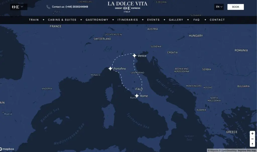 オリエント急行の伝統的なルートは、1883年に開通したパリからイスタンブール(当時はコンスタンティノープル)までの路線が有名ですが、近年ではオリエント急行のブランドを利用して、さまざまな豪華列車の旅が提供されています。「La Dolce Vita」はその一例であり、イタリア国内を中心とした豪華旅行をテーマにしています。