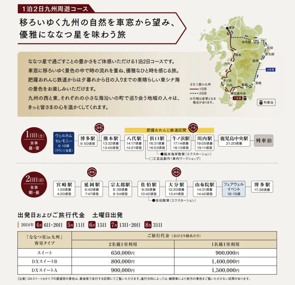 一泊二日の九州周回コースで、料金は2名人用のDXスイートAで最高価格180万円程度となるようです。