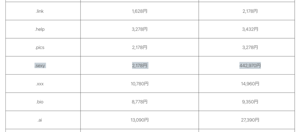 今回の価格改定で最も注目すべきは、特定のドメインの価格が劇的に上昇するケースです。例えば、「.sexy」というドメインは、これまで2,178円で提供されていたものが、改定後はなんと442,970円になります。このような極端な値上がりは、契約者にとって予想外の支出となる可能性があります。