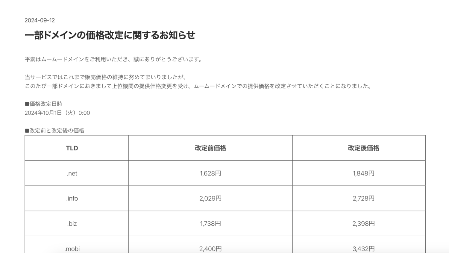 2024-09-12 一部ドメインの価格改定に関するお知らせ