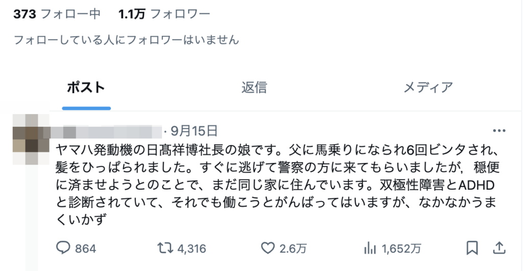 一昨日、Twitterで「ヤマハ発動機社長の娘」を名乗るアカウントが意味深なツイートをしており、話題になりました。最初に私がそのアカウントを見た時は、最新の投稿に対して「いいね」が500件ほどで、フォロワーも非常に少ない状況でした。