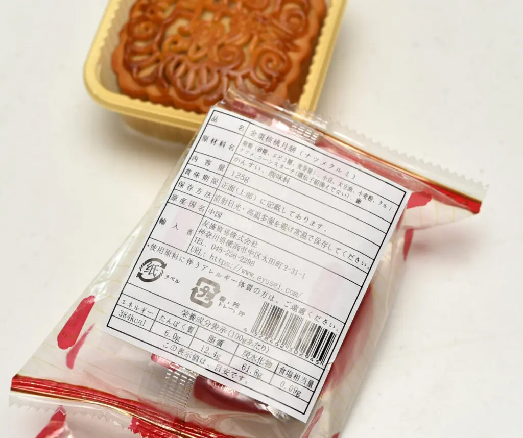 材料も驚くほどシンプルです。砂糖(ぶどう糖、麦芽糖)、小豆、大豆油、小麦粉、クルミ、ナツメ、コーンスターチ、卵かんすい、酸味料(クエン酸)といった、基本的な材料のみ。しかしながら、こうしたシンプルな構成でありながら、味の奥深さを感じることができるのは、本場中国の月餅ならではの魅力といえるでしょう。