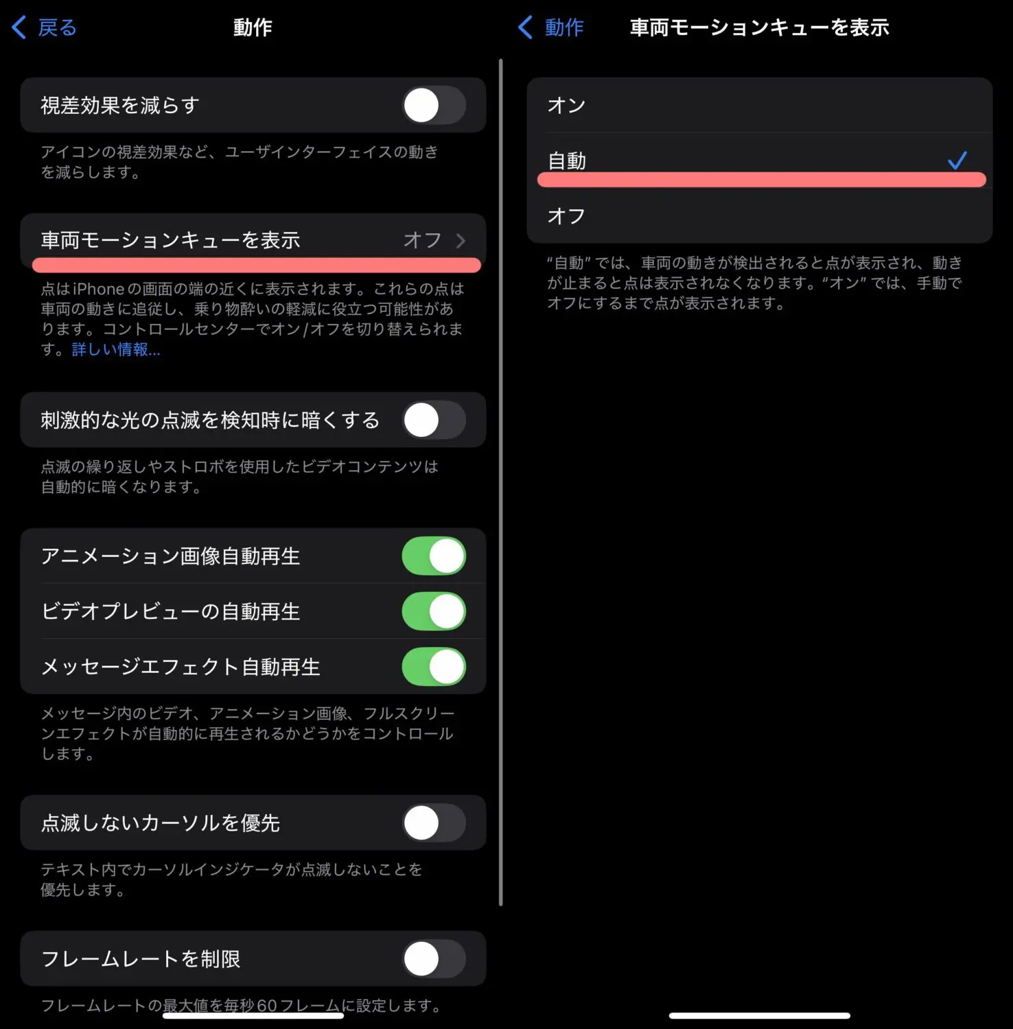 これにより、iPhoneが車の動きを検知し、画面上に動きを示すドットが表示されることで、乗り物酔いを軽減できるようになります。