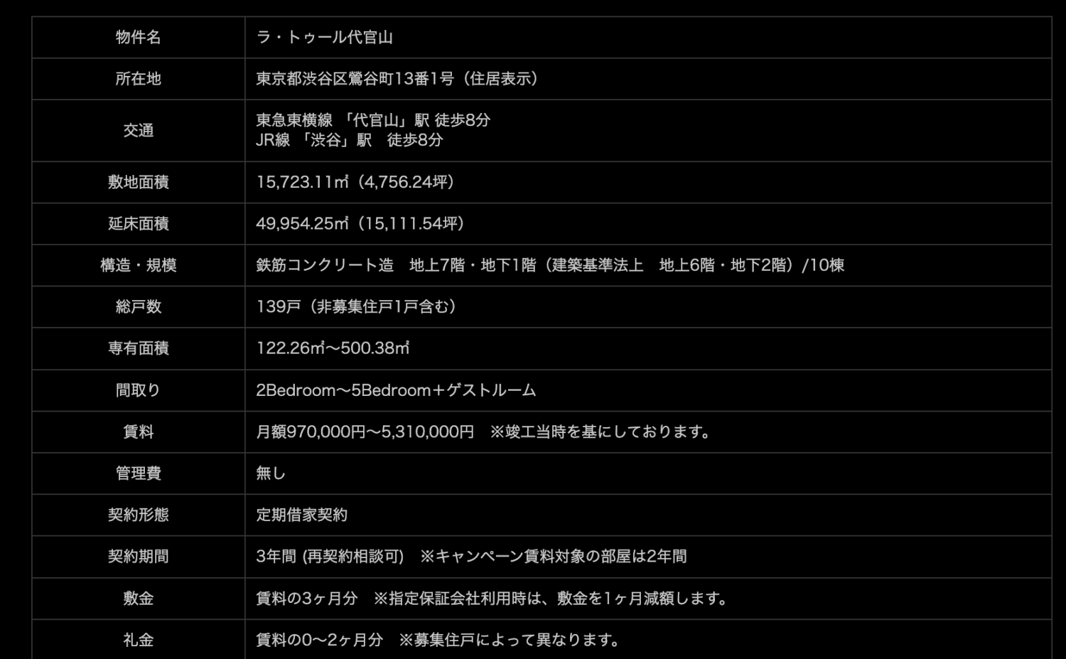 最後に、ラ・トゥール代官山は、賃貸専用の高級マンションで、月額賃料は1LDKで約100万円〜、広い部屋では500万円以上に達します。