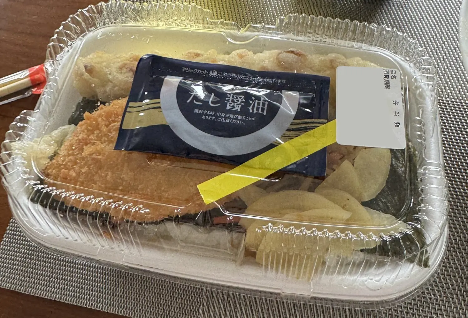 炊きたてのご飯の上にはおかか昆布とパリパリの海苔が乗り、白身魚のフライや大きなちくわ天が付いています。これがまたジューシーで、自宅で揚げたてを食べるような感覚です。ボリュームも十分で、一つ食べれば夕食として十分満足できます。忙しい時には、これ一つで済ませるという選択がよくわかります。