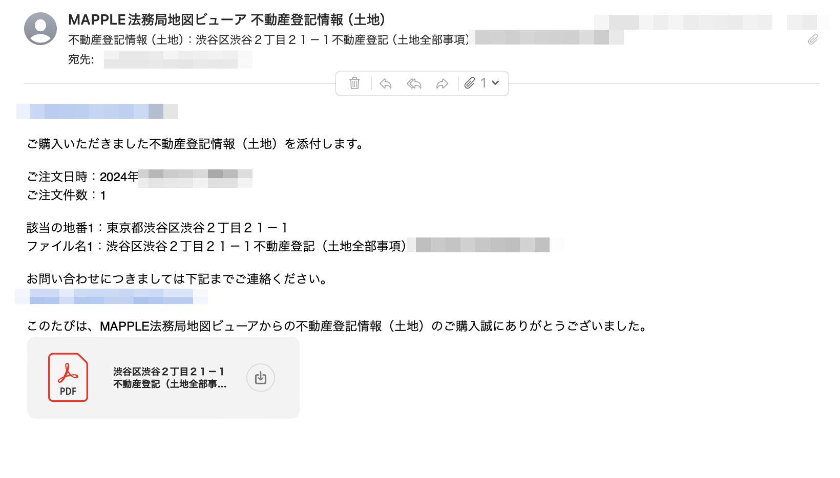 不動産登記情報(土地)を購入(オンライン決済画面に移動) キャンセル 【備考】 1. 不動産登記情報(土地)の取得は、株式会社トーラスのAPIを利用しています。 2. 不動産登記情報(土地)の送信までに、オンライン決済完了から15分程度かかります。 不動産登記情報(土地)は、MAPPLE法務局地図ビューアで登録されたお客様のメールアドレスあてに、メールの添付ファイル(PDF)として送付いたします。マップル(mapple_registry@mapple.co.jp)からのメールが受できるよう、事前にご確認をお願いいたします。 4. メールが届かない場合、大変お手数ですが、mapple_registry@mapple.co.jpまで下記を記載の上、お問い合わせください。 ・アカウント登録しているメールアドレス ・ご購入された地番(●●市AA町100番地 等) ・ご購入のおおよその日時 本機能で購入できる不動産登記情報(土地)は、一般財団法人民事法務協会「登記情報提供サービス」で購入できるものと同じです。 6. 商品の特性上、返品、お客様都合のキャンセルは承っておりません。 7. 検索結果で表示された場所はおおよその位置を表示していますので、お探しの住所(地番)の位置と異なることがあります。 8. 地図上に表示している地番の情報が古い場合があります。 9. オンライン決済画面の有効期限は1時間です。無効になった場合は、再度、地番の選択から操作してください。 10.オンライン決済画面の「カード情報を保存する」では、次回の決済からSMS(ショートメッセージ)を用いた認証コードでクレジットカード情報を自動入力できます。保存する場合は、オンライン決済画面のCONTACT欄にSMSを受できる電話番号を入力してください。 11. オンライン決済画面のメールアドレス欄はレシート受取用のアドレスです。不動産登記情報は、MAPPLE法務局地図ビューアでご登録いただいている上記の送付先アドレスにお送りいたしますので、ご注意ください。 アカウント利用規約 配送・送料についてお支払い方法について特定商取引法に基づく表記