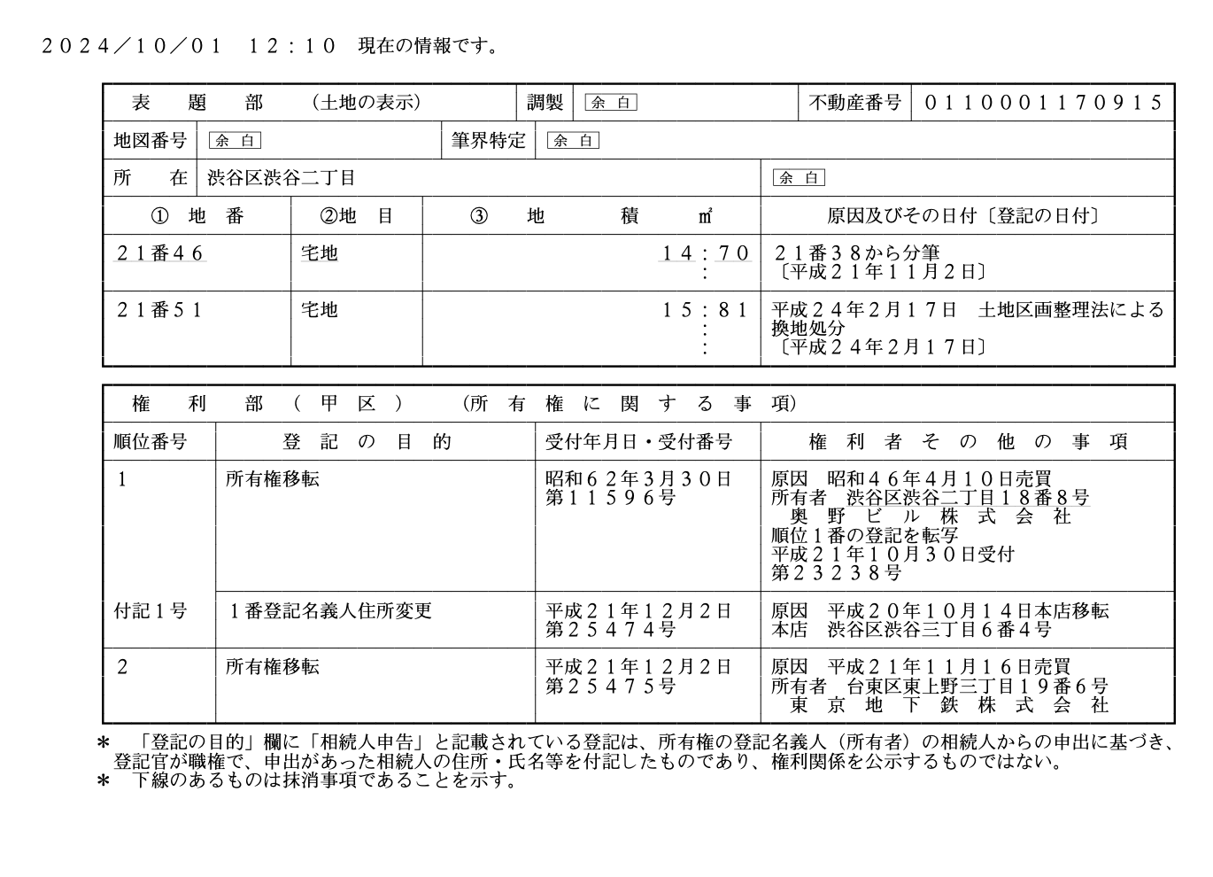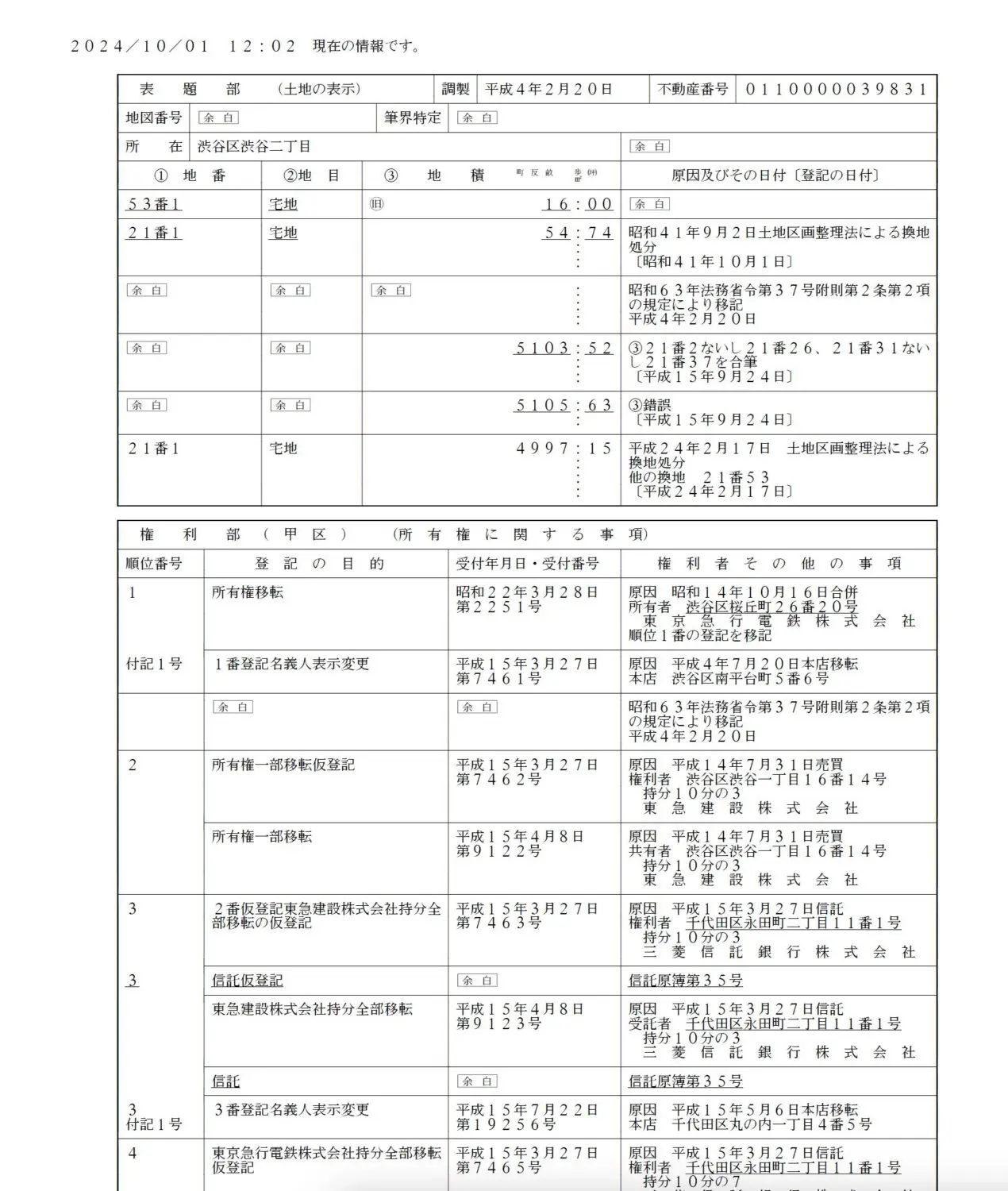 実際に渋谷ヒカリエの土地に関する不動産登記情報を取得してみた結果、次のような詳細が確認できました。