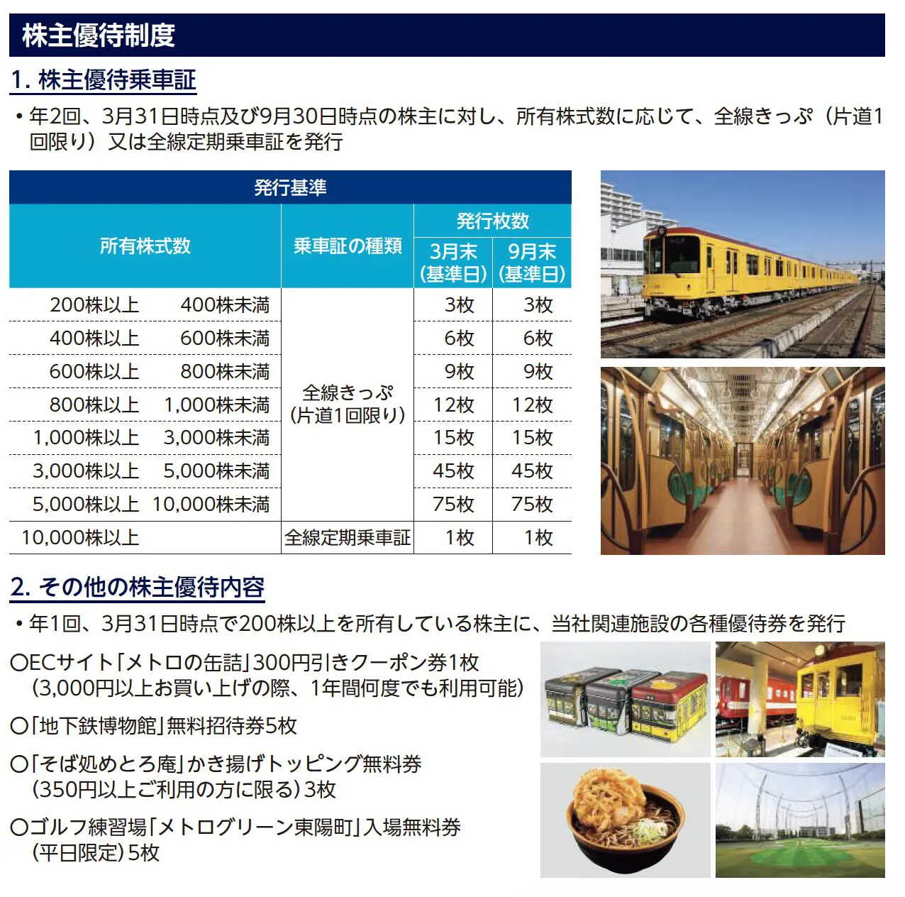 東京メトロは、連結配当性向40%以上を目指し、継続的かつ安定的な配当を基本方針としています。これにより、株式を保有する投資家にとって、長期的な利益が見込める安定した投資先となるでしょう。また、株主優待制度も導入され、株式保有数に応じて、地下鉄乗車券や商業施設での特典が受けられる予定です。