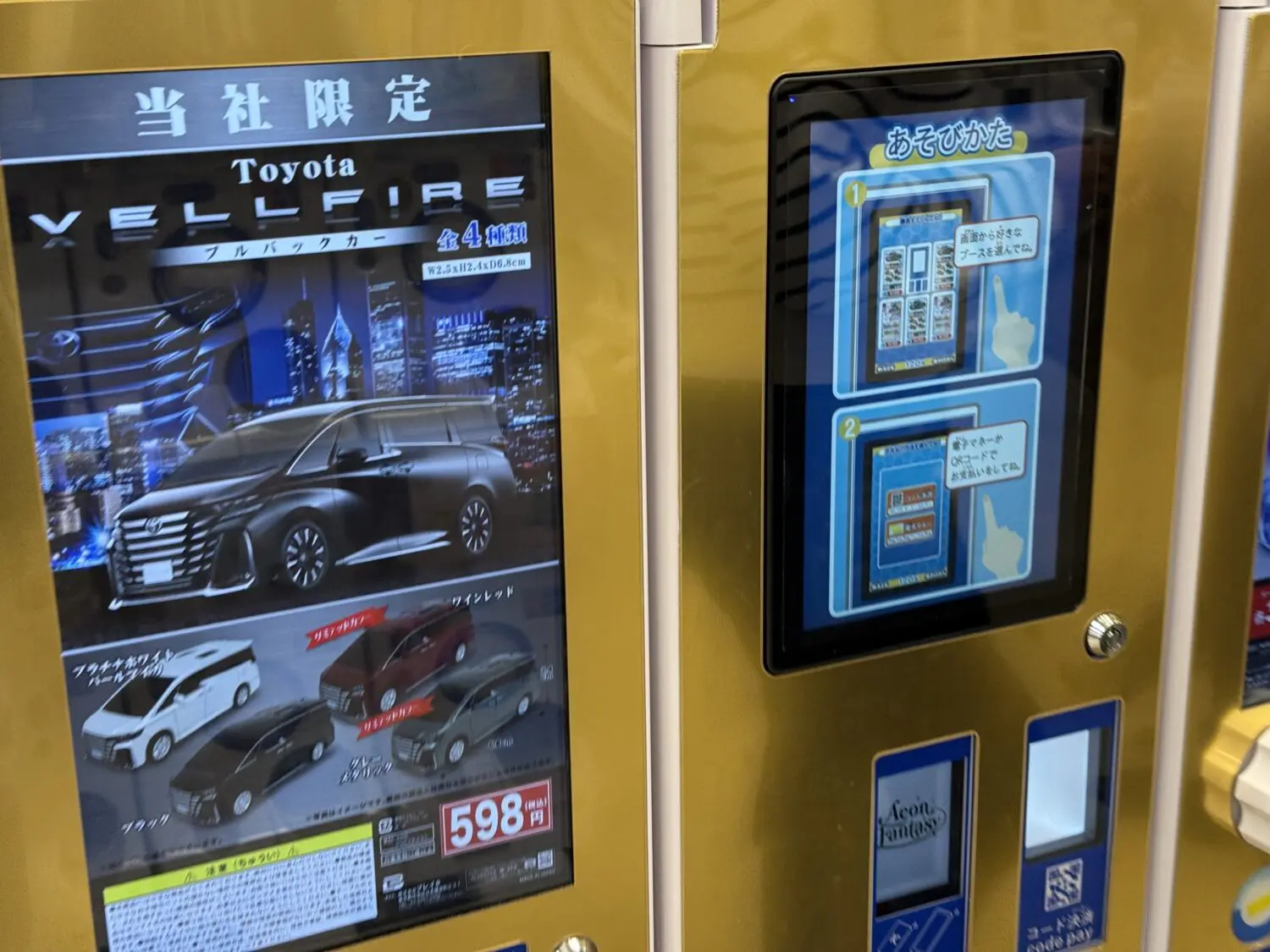 価格は500円から600円といった商品が多いのですが、内容を見てみると、その価格に見合うクオリティの高さが感じられます。特に、トヨタの「ベルファイヤー」をモデルにしたガチャガチャは598円という設定で、まるでスーパーの特売品のような価格設定で驚きました。