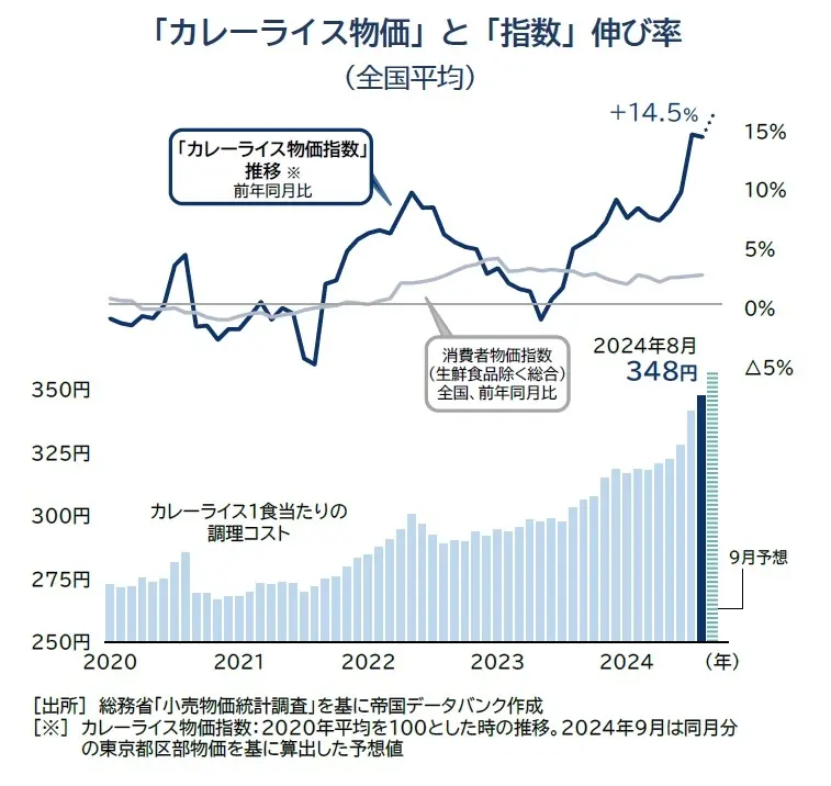 2024年8月、株式会社帝国データバンクが発表した「カレーライス物価指数」によれば、1食あたりのコストは348円に達し、過去5カ月連続で最高値を更新しました。
