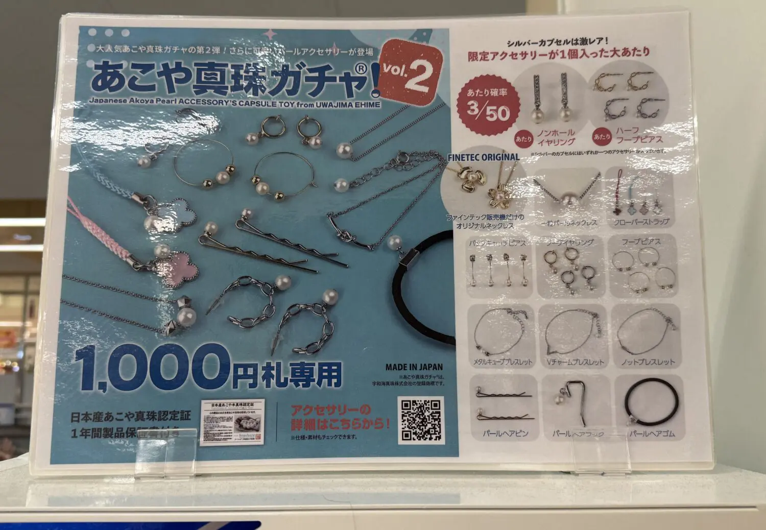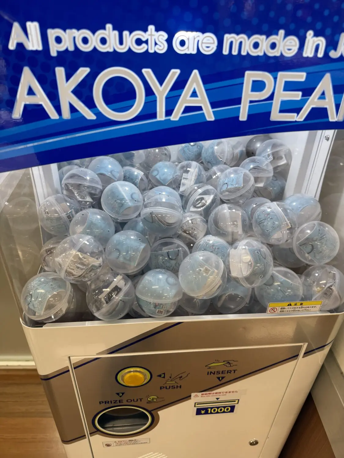 普段見かけないガチャガチャを発見し、興味本位で近づいてみると、なんと真珠を使ったアクセサリーが出てくるという驚きの内容でした。本格的なあこや真珠を使用しているだけあり、1回1000円という価格設定。何が出てくるかは完全に運次第ですが、真珠を使ったアイテムとしては非常にお手頃に感じました。