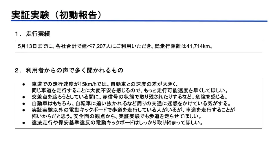 この資料の感想を見ても「自動車との速度差が大きいので、最高速度を時速15km以上にして欲しい」という最高速度引き上げと同時に、「歩道を走らせて欲しい」という、現在のLUUPの問題点を組み合わせたような意見が出ている。