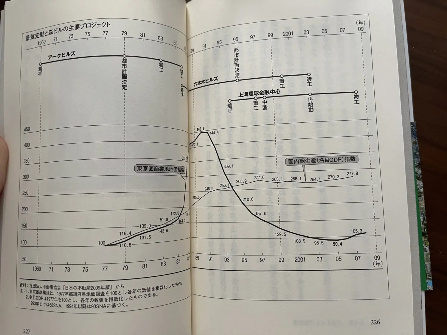 バブル崩壊後、地価の急落により多くの不動産プロジェクトが巨額の損失を被りました。1980年代後半の土地取得価格がピークに達した時点で投資した多くの企業や個人は、その後の急激な価格下落により大きなダメージを受けました。この図に示されているように、1990年代のバブル崩壊後、地価は1990年のピークからほぼ半減し、2000年代初頭まで低迷が続きました。