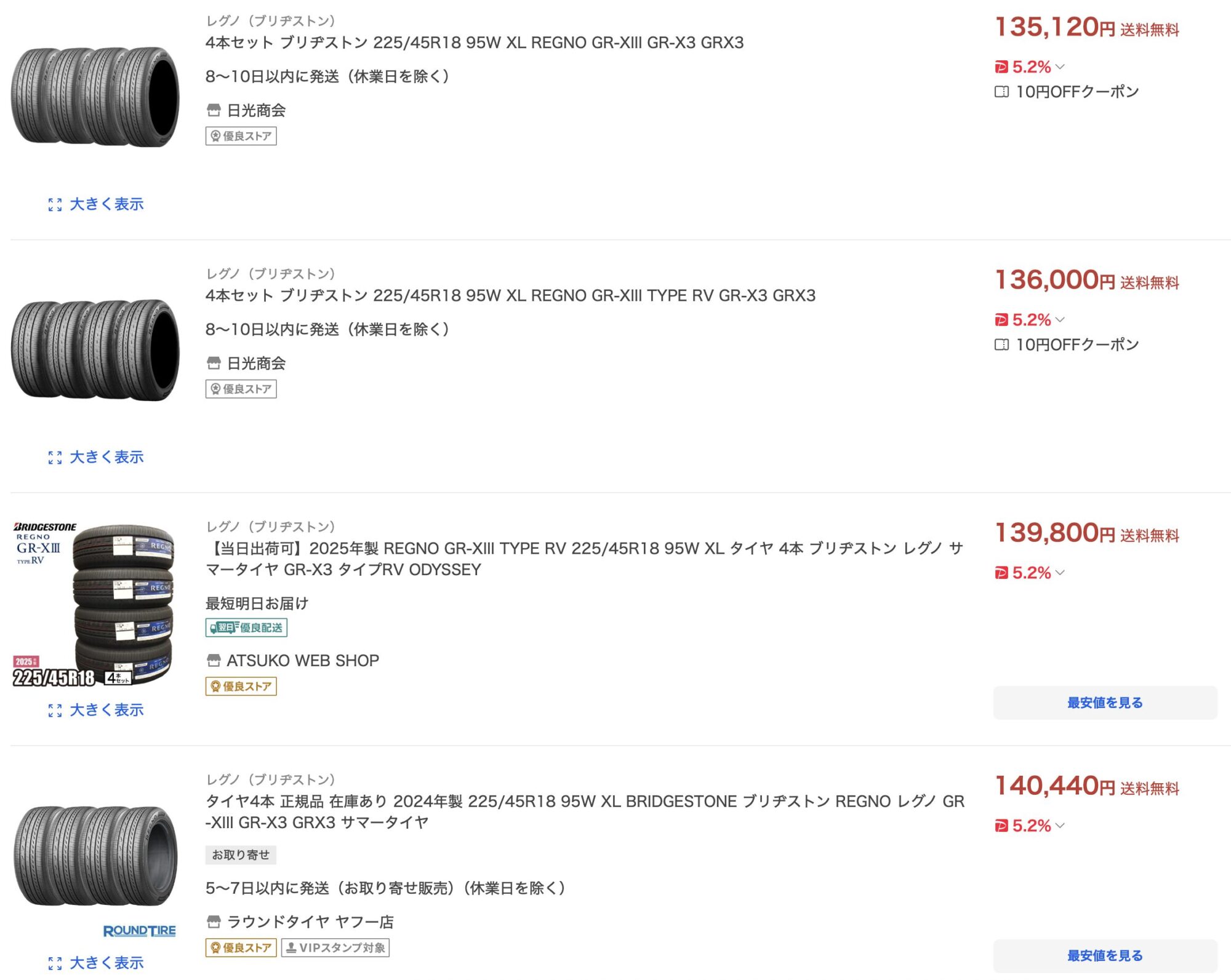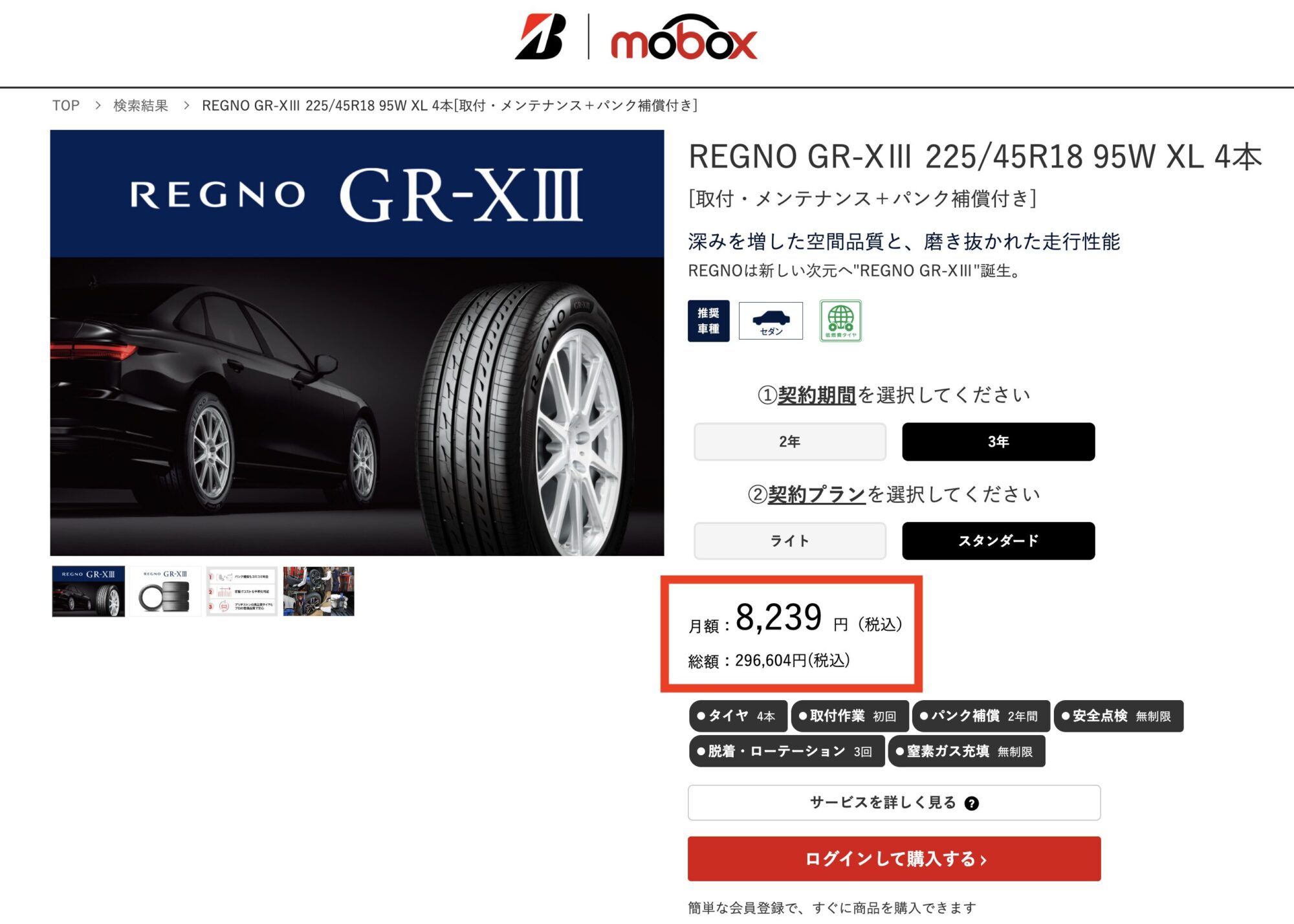 例えば REGNO GR-XⅢ(225/45R18) の場合、スタンダード3年プランで月額8,239円、総額296,604円。一方で、Yahoo!ショッピングなどでは同じタイヤが**約135,120円(税込・送料無料、ポイント還元込みで実質12万円台)で購入可能です。