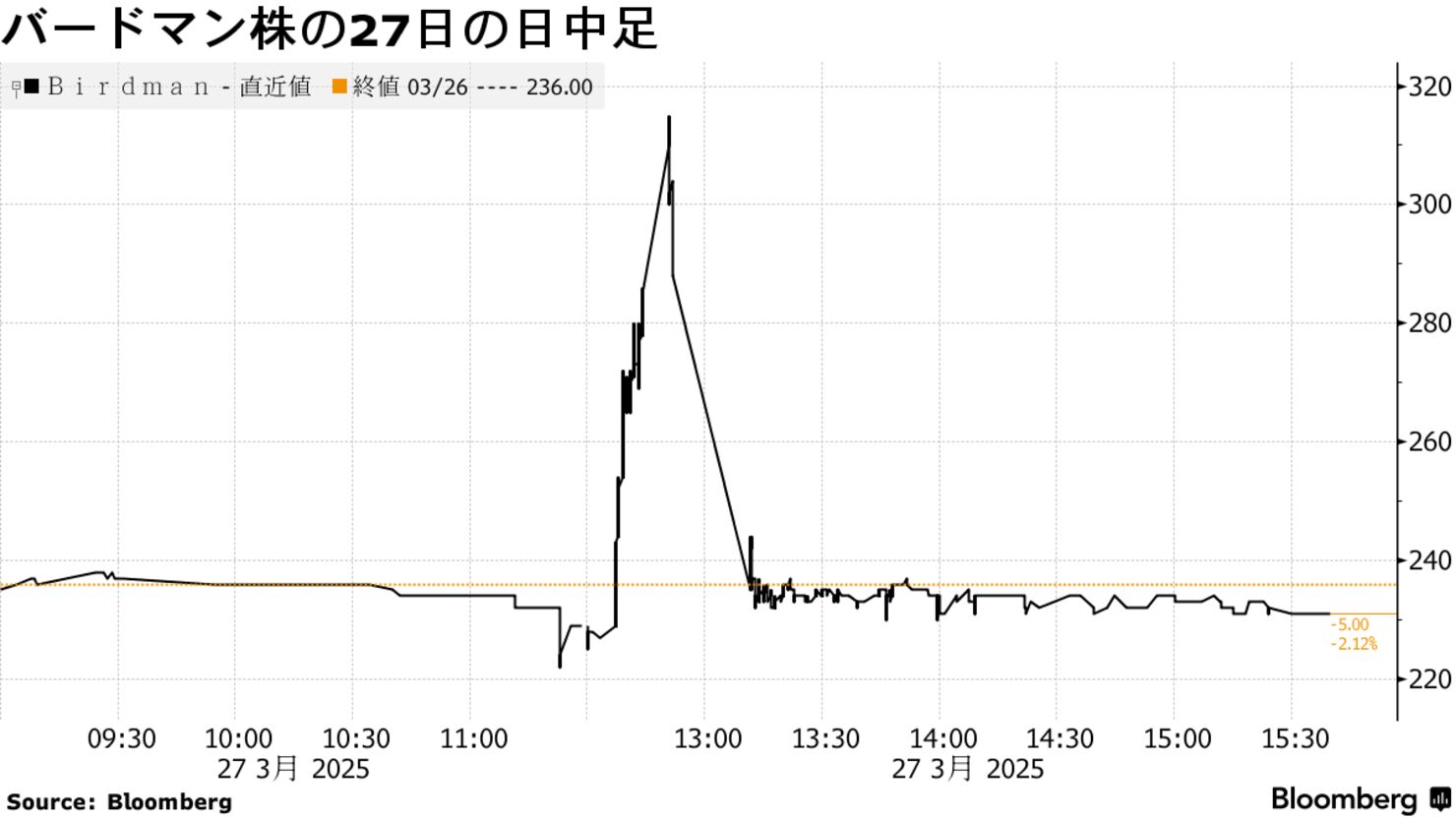 Bloombergの報道でも、以下のような一時的に高値でぶつけるような跡が残っていて、その後元の水準に株価が下がっているのがわかります。