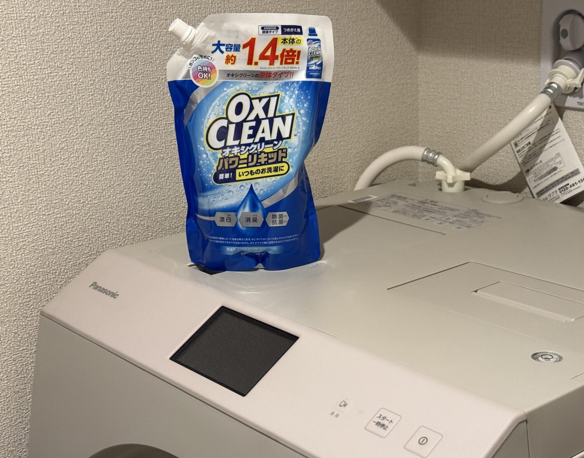 あの「ちいかわ」にも登場して話題になったオキシクリーン パワーリキッド(酵素系漂白剤)です。これを3つ目のリザーブタンクにセットし、さらに酵素系の洗剤は温度が高くなるほど効果を発揮するため、約60℃のおまかせ高温コースにプリセット。