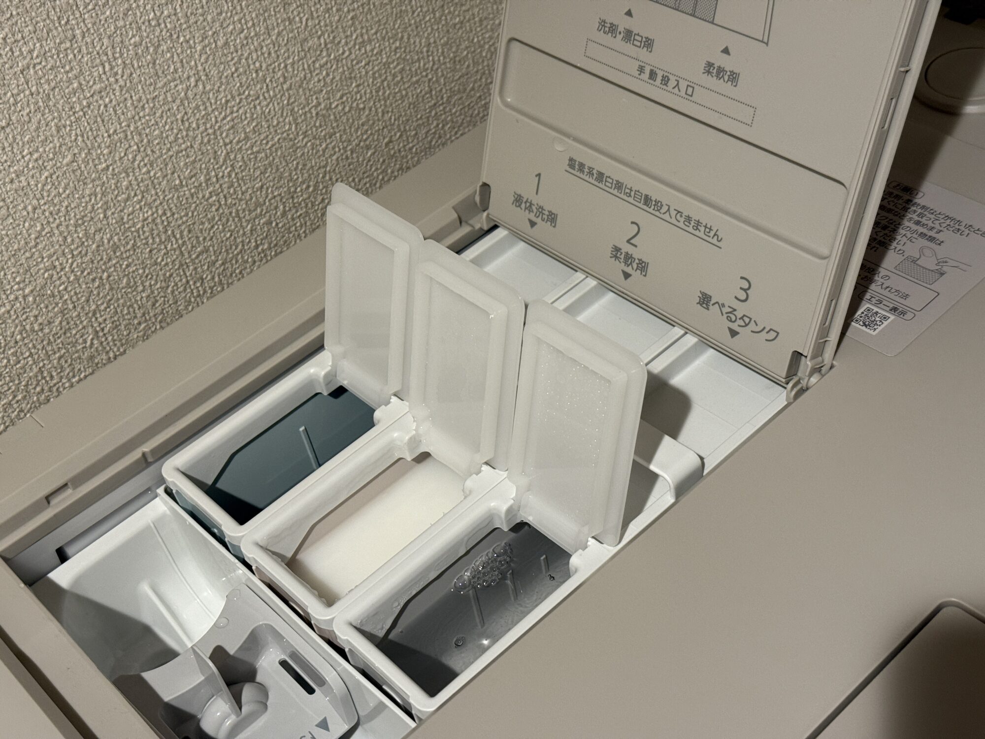 さらにもう一つ印象的だったのが、洗剤タンクの数。これまでは2つしかなかったのが、今回のモデルでは3つに増えています。正直、最初は「3つも必要かな?」とやや否定的な印象を持っていたのですが、ある理由から今では「3つあって本当によかった」と心から思っています。