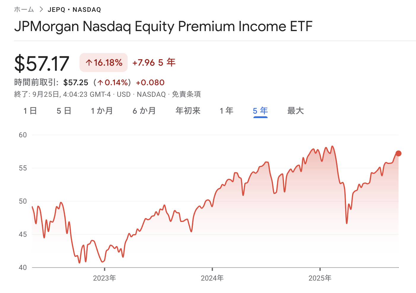 JEPQの株価は直近で 約$57.16。