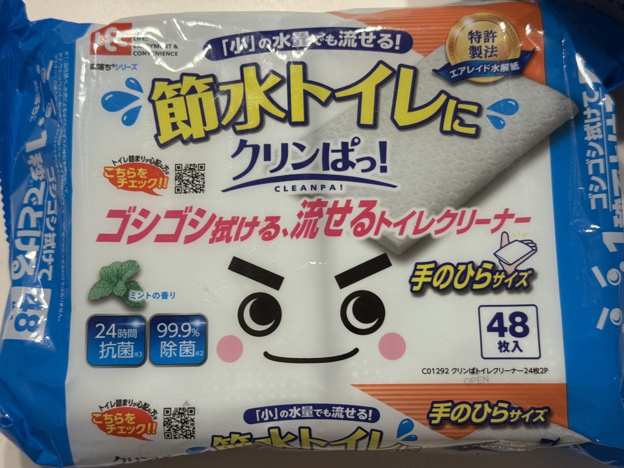 私はあわせて「クリンパ」という流せるトイレクリーナーも購入しました。これがワンタッチワイパーにぴったりで、水に溶けやすくトイレに流しても安心なタイプです。使う直前に床へ1枚置き、ワイパーを押し付けるだけでセット完了。この一瞬で準備ができる手軽さは、一度体験すると本当に手放せません。