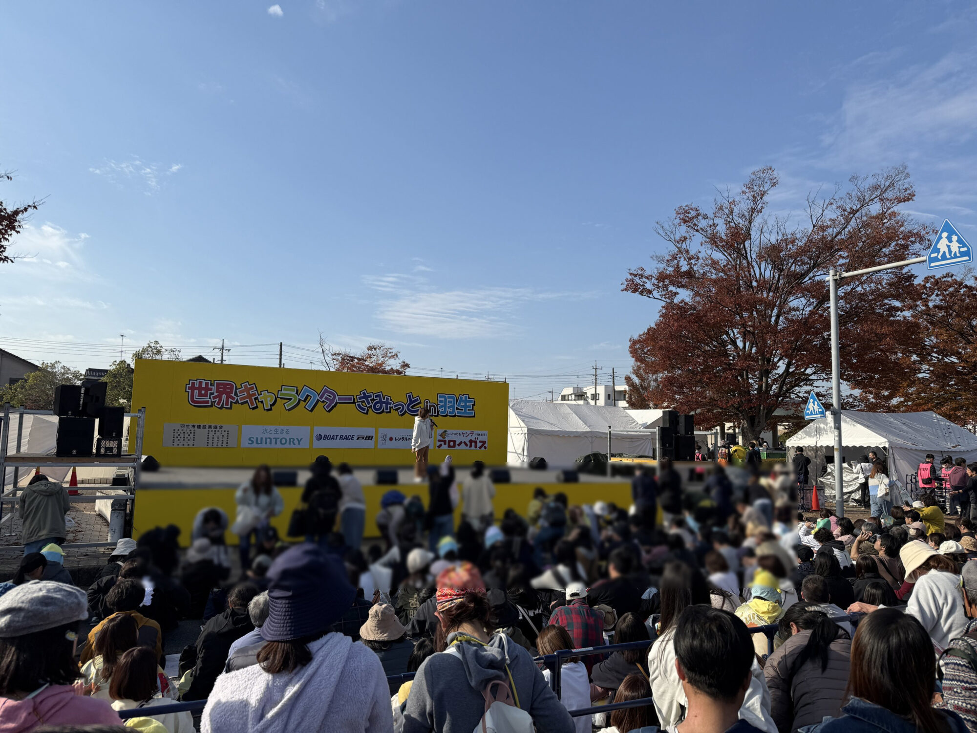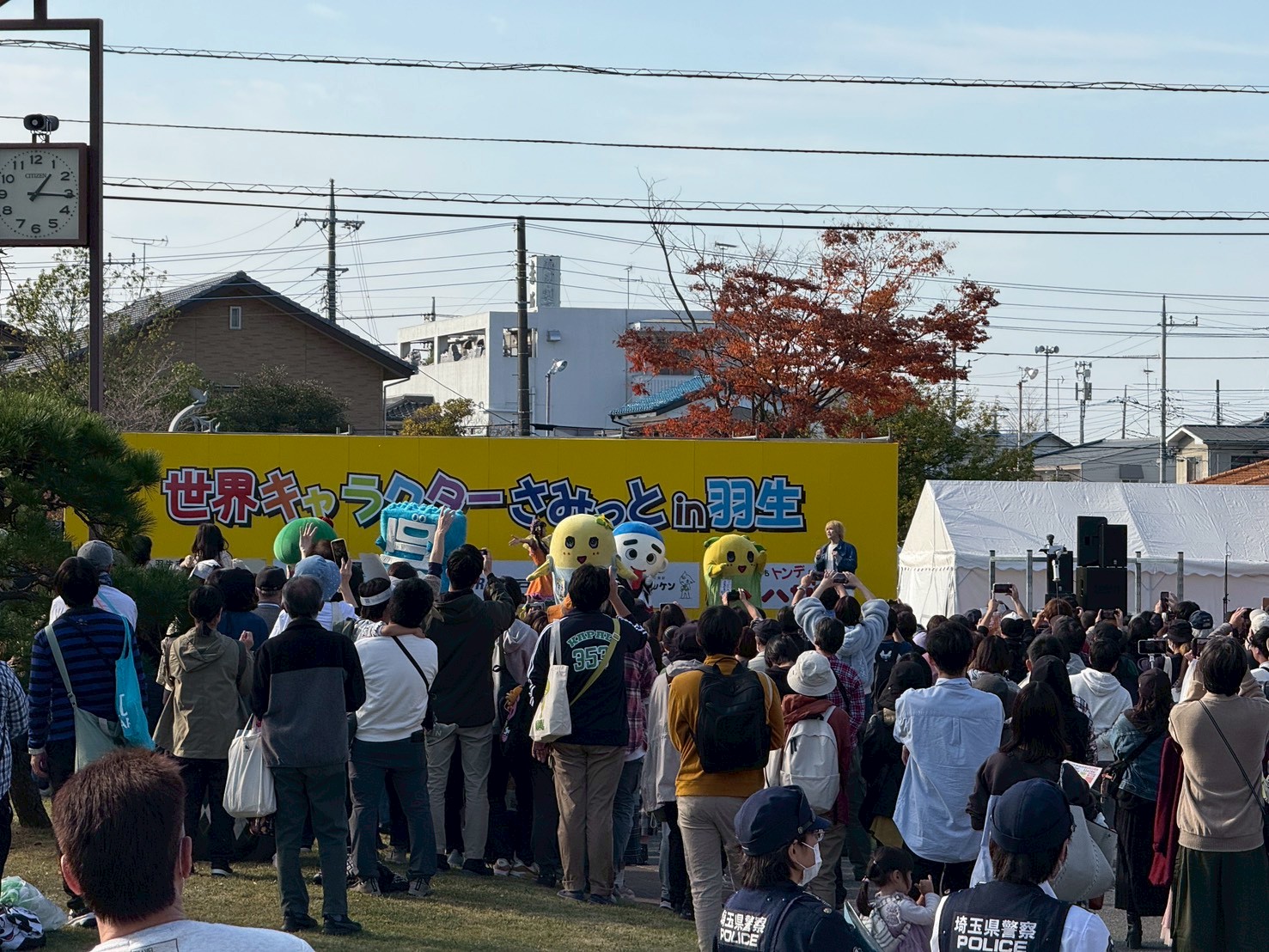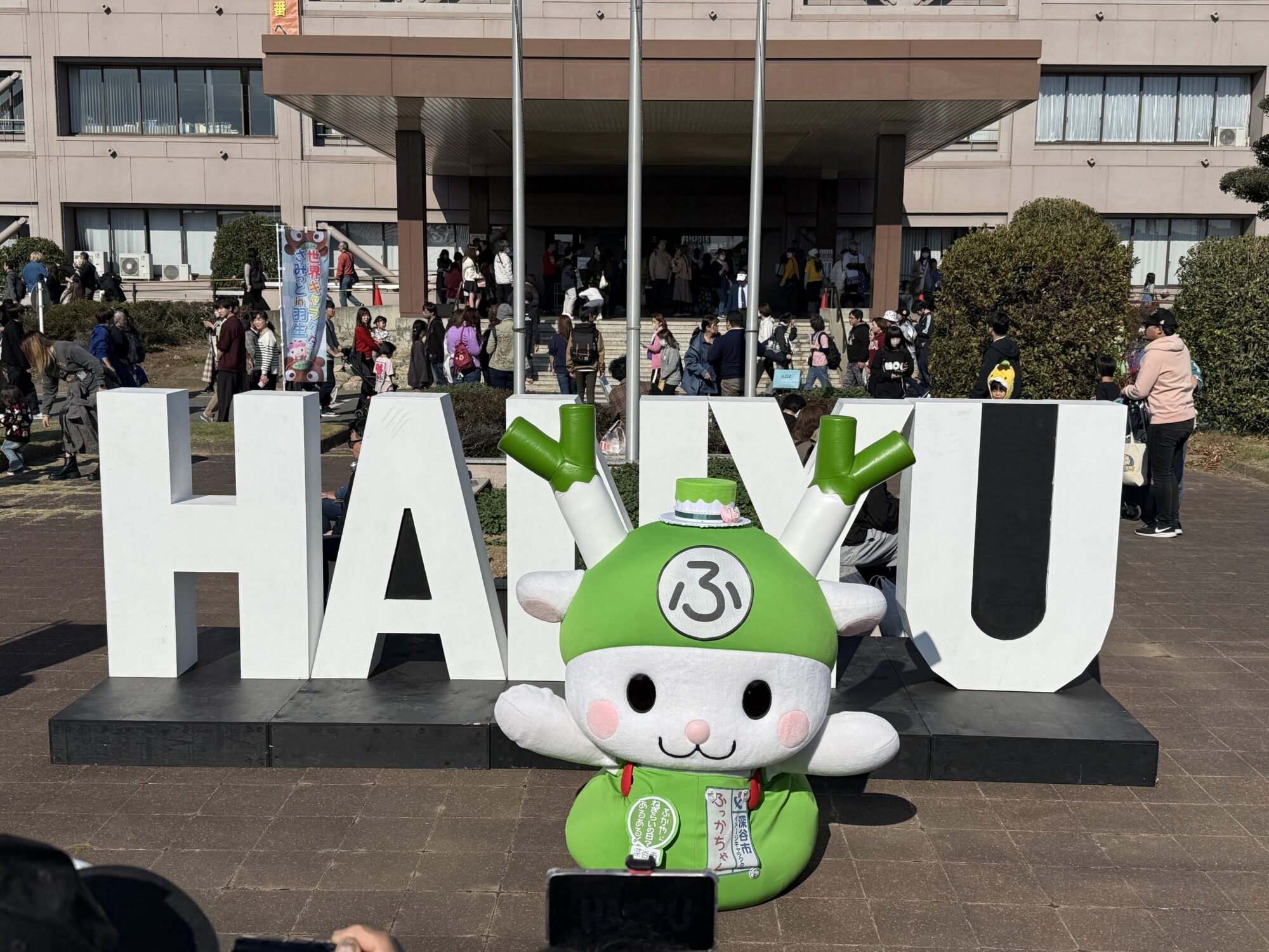 会場は羽生市役所と隣接する公園一帯で、当日は交通規制が入り、広いエリアが歩行者天国のようになります。時間は10時〜15時と比較的コンパクトですが、その分密度が非常に高く、どの時間帯でもキャラクターに出会えます。
