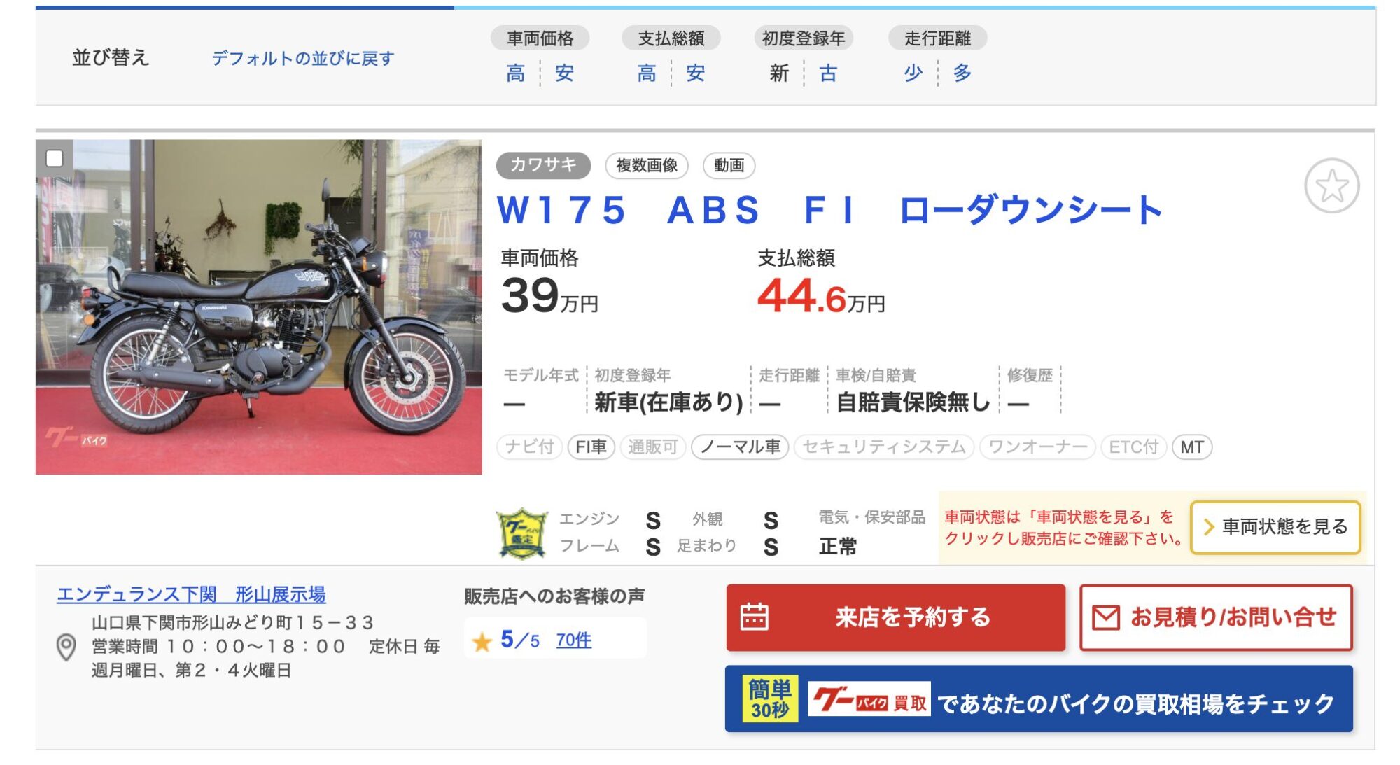 車両価格39万円/支払総額44.6万円 で提示されています。取り扱いは エンデュランス下関 形山展示場 の展示場。一方で関西の並行輸入ショップで販売されるインジェクション+ABS装備のW175インポート車は、車両価格29.74〜29.99万円/支払総額37〜38万円前後 で提示されています。