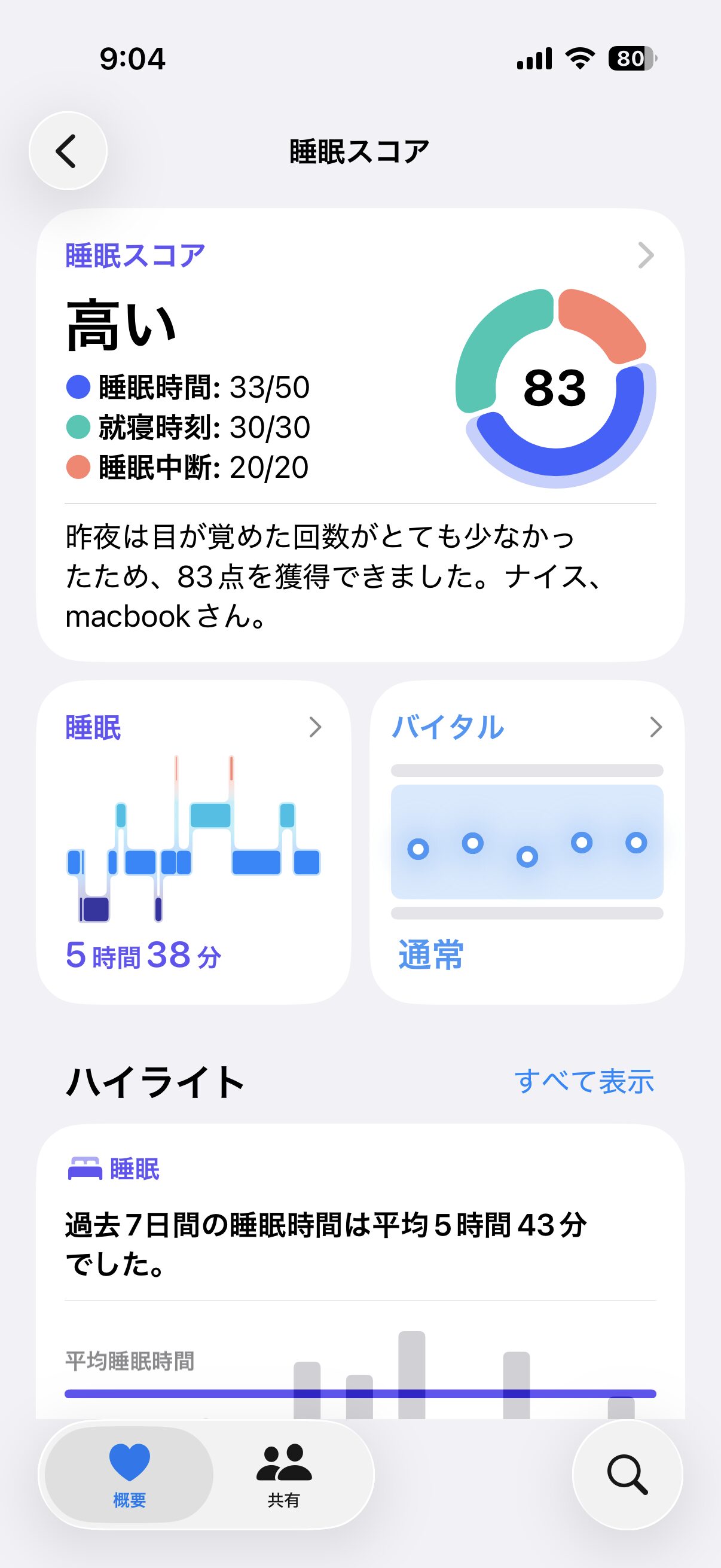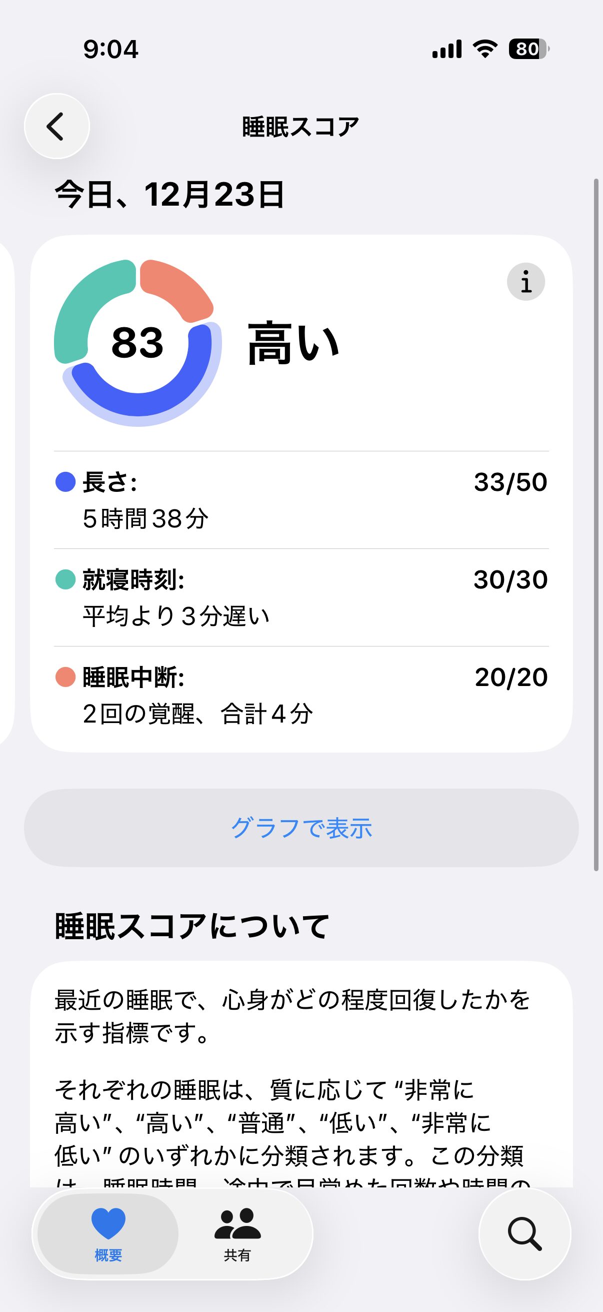 この3つを合計100点として評価し、その日の睡眠が「非常に高い」「高い」「普通」などの段階で表示されます。今回のデータでは、睡眠時間は5時間38分とやや短めだったものの、就寝時刻と睡眠中断のスコアが高く、結果として83点(高い)という評価になっていました。