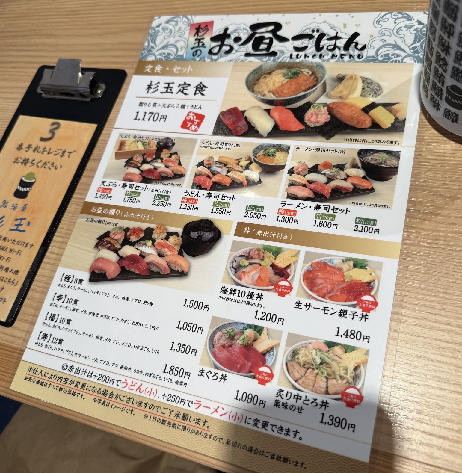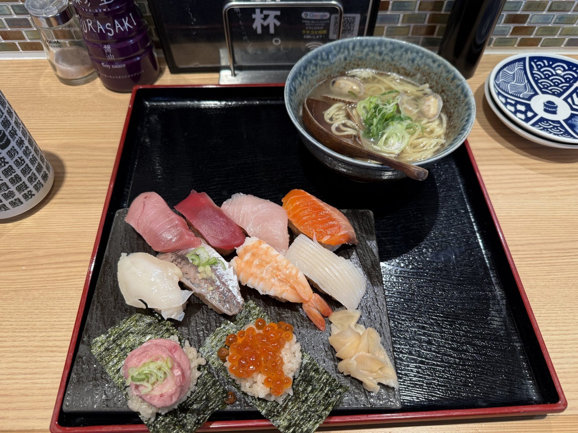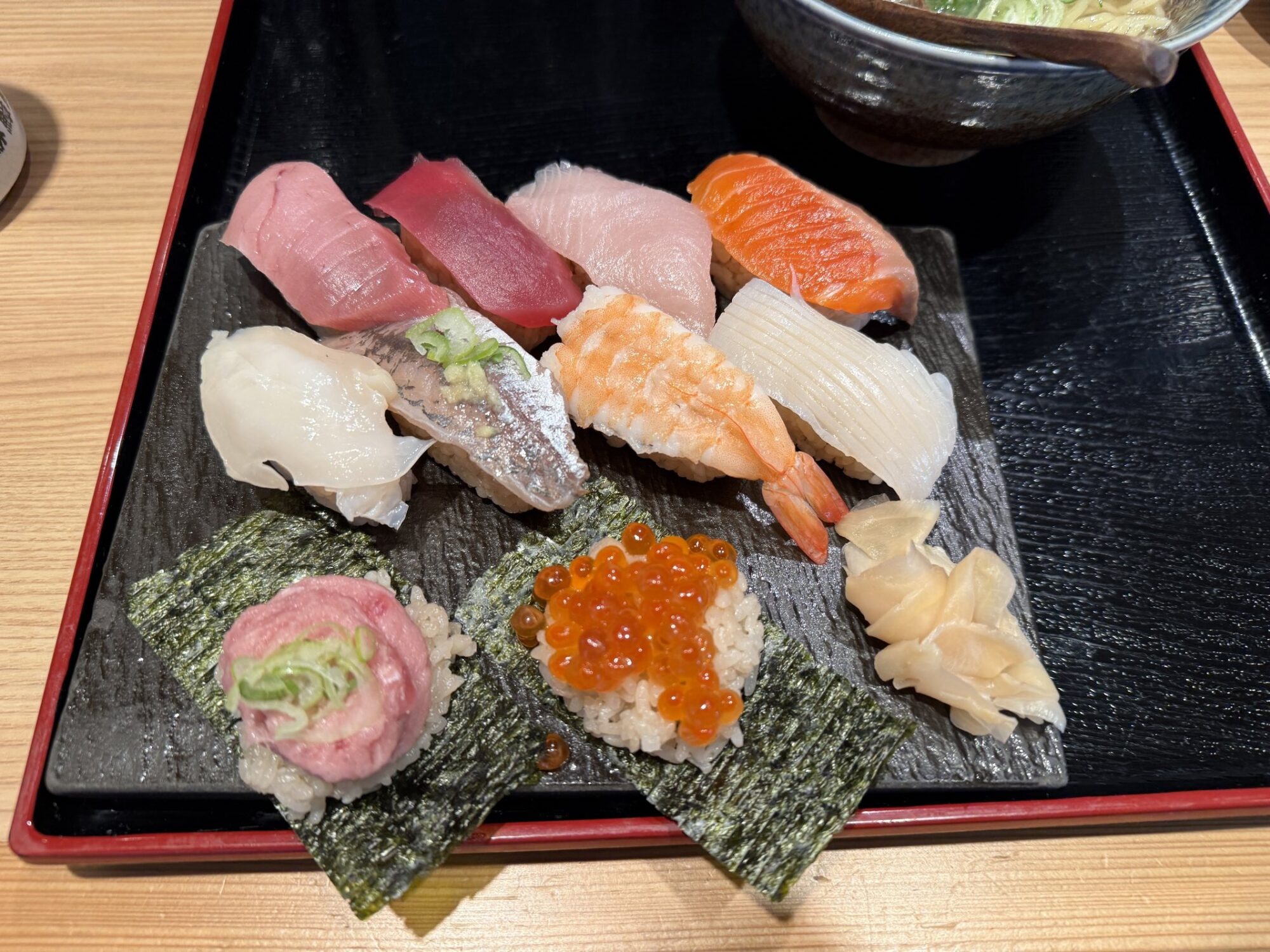 実際、セブンイレブンでサーモンハラス丼のようなシンプルなものが、1,100円近くしていて、思わず腰を抜かしました。それを考えると、新鮮で美味しいお寿司が10貫、小さいラーメン付き、お茶も飲み放題で、しかもフルサービス。