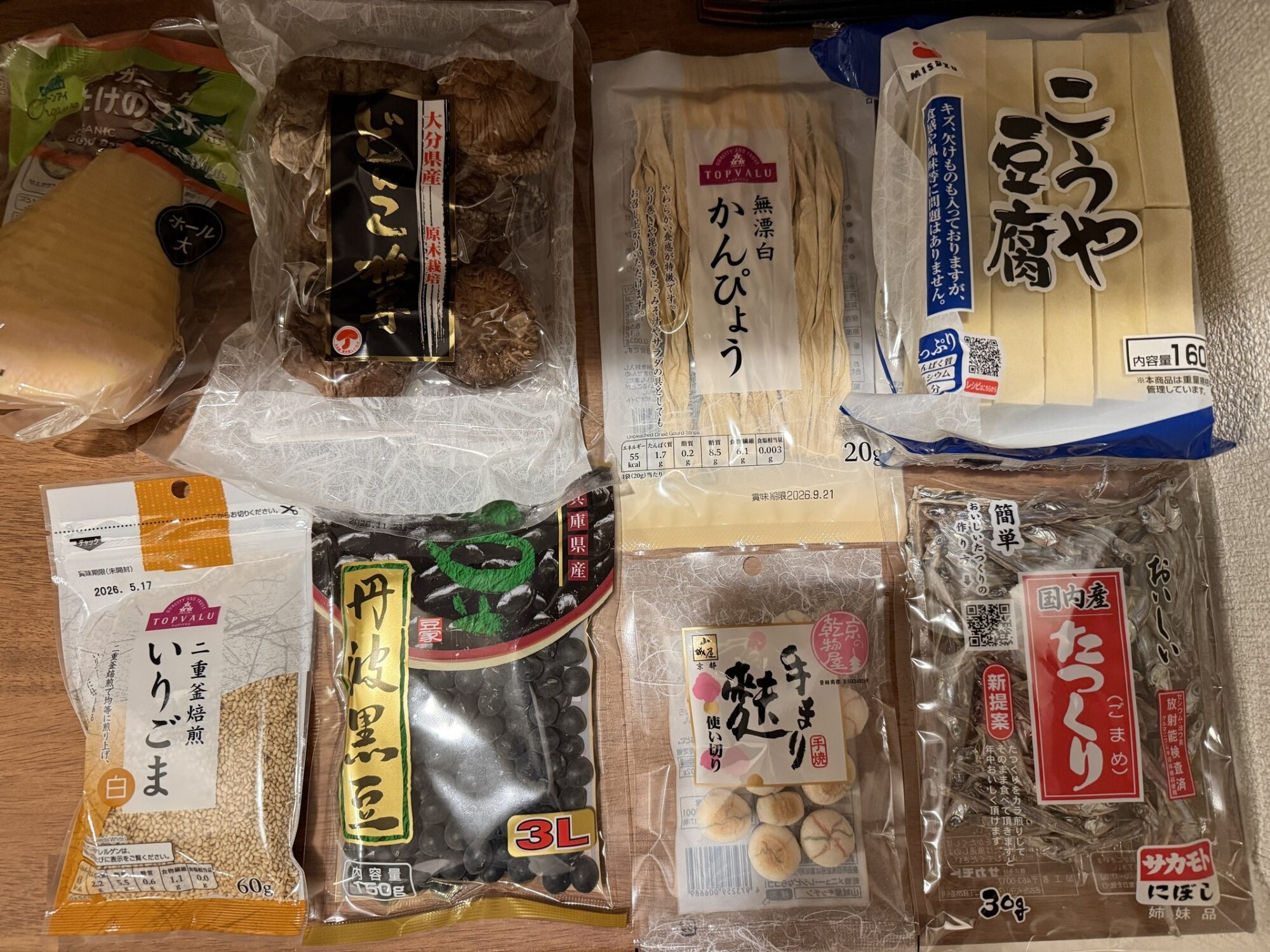 干し椎茸は一番大きいどんこを選びましたが、これは小ぶりな方が食べやすく、使いやすく、味も良いと感じました。筍も1本で十分で、年末にはスーパーに生の筍が並ぶので、それを使えば品質を上げられます。