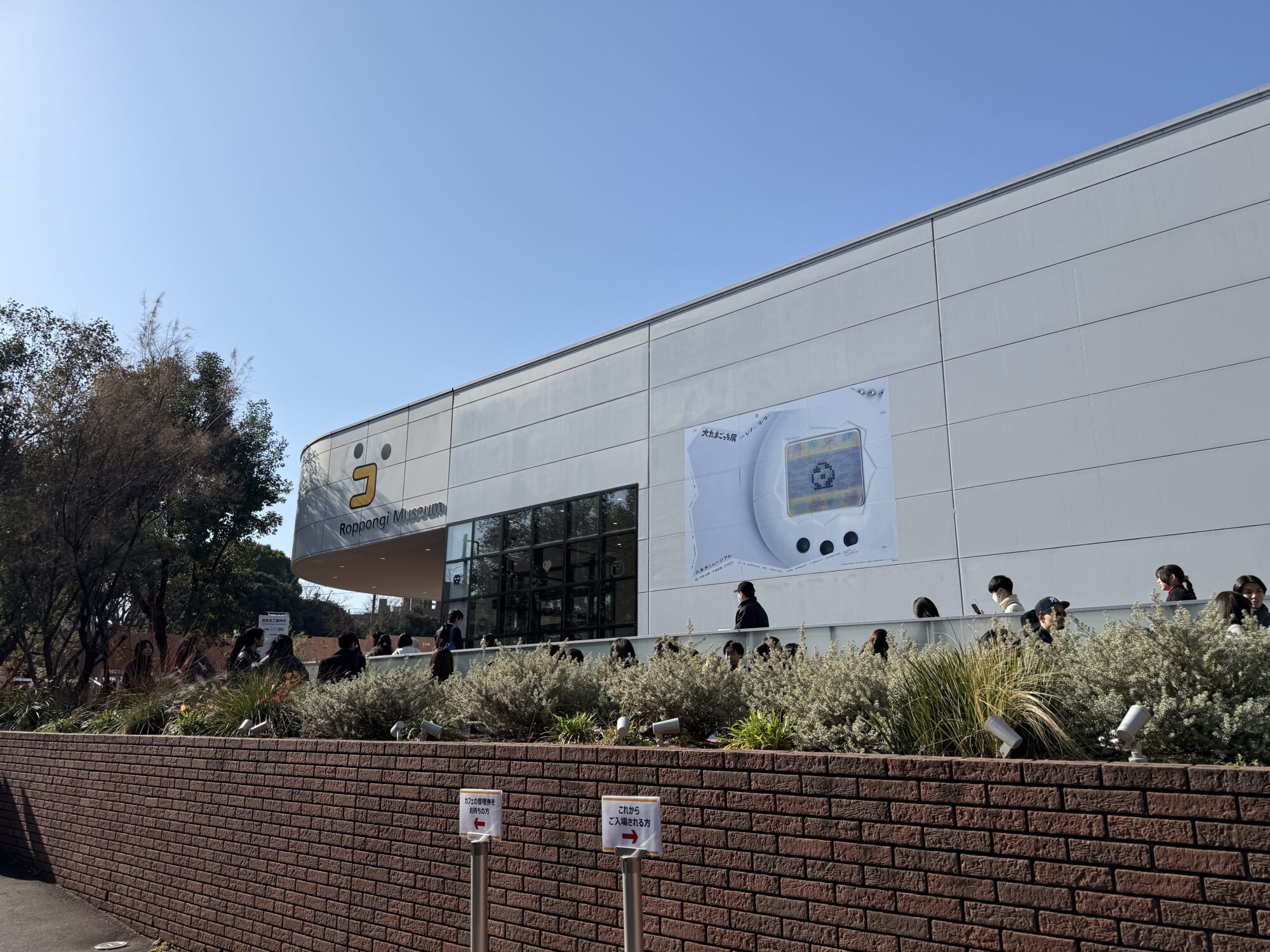 すでに外観からしっかり装飾されており、たまごっちの「ゴ」のマークが印象的です。外には多くのファンが並んでいて、来場者は子どもだけでなくカップルが非常に多い印象でした。