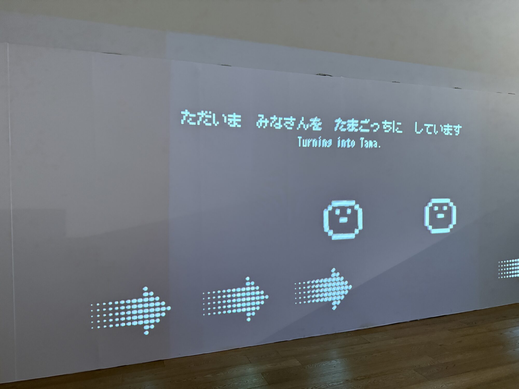 会場を進むと、プロジェクターのような仕組みで壁一面に映像が投射され、「皆さんをたまごっちにしています」という大きな案内が現れます。これだけでもなかなかワクワクする演出です。