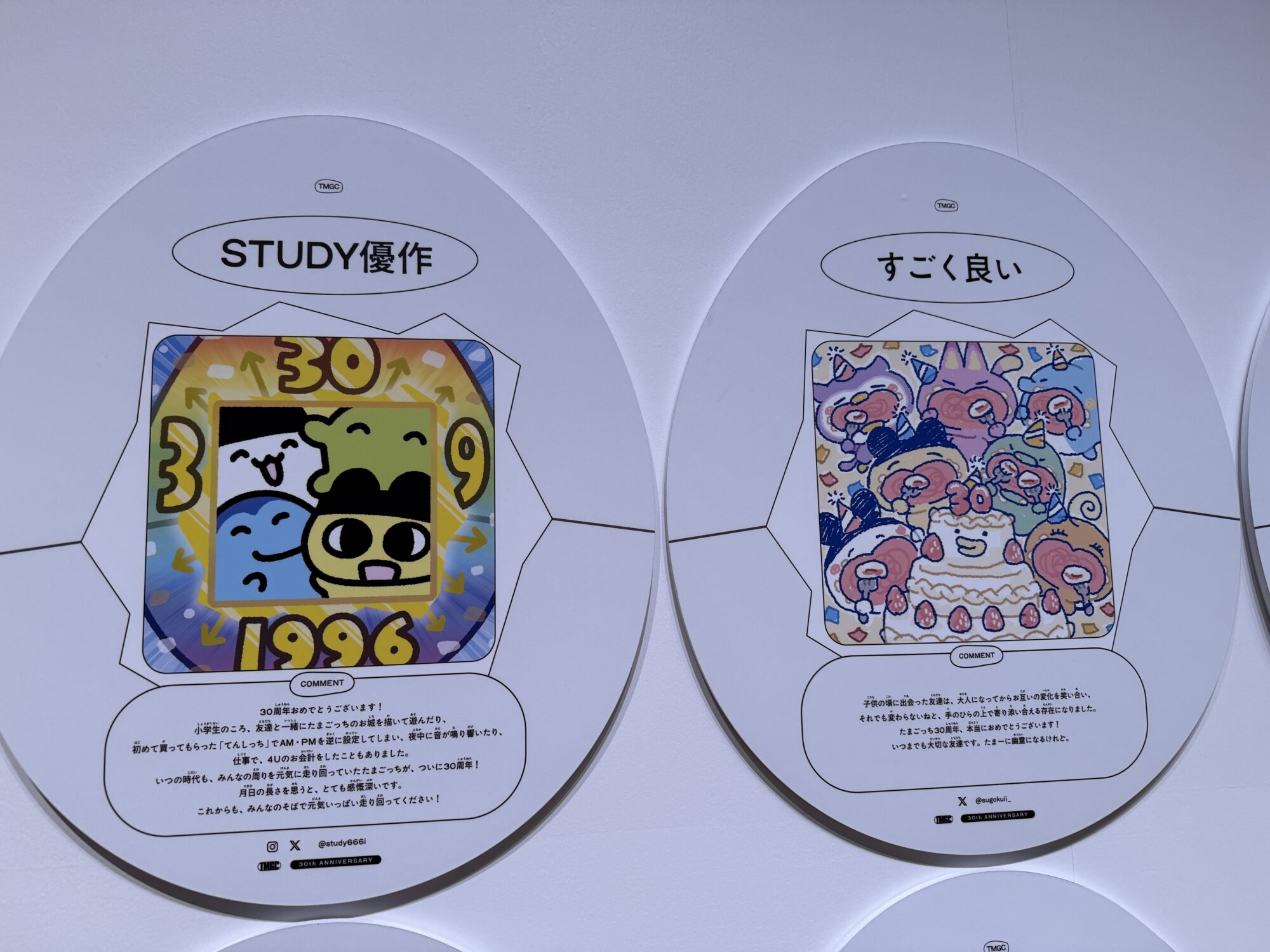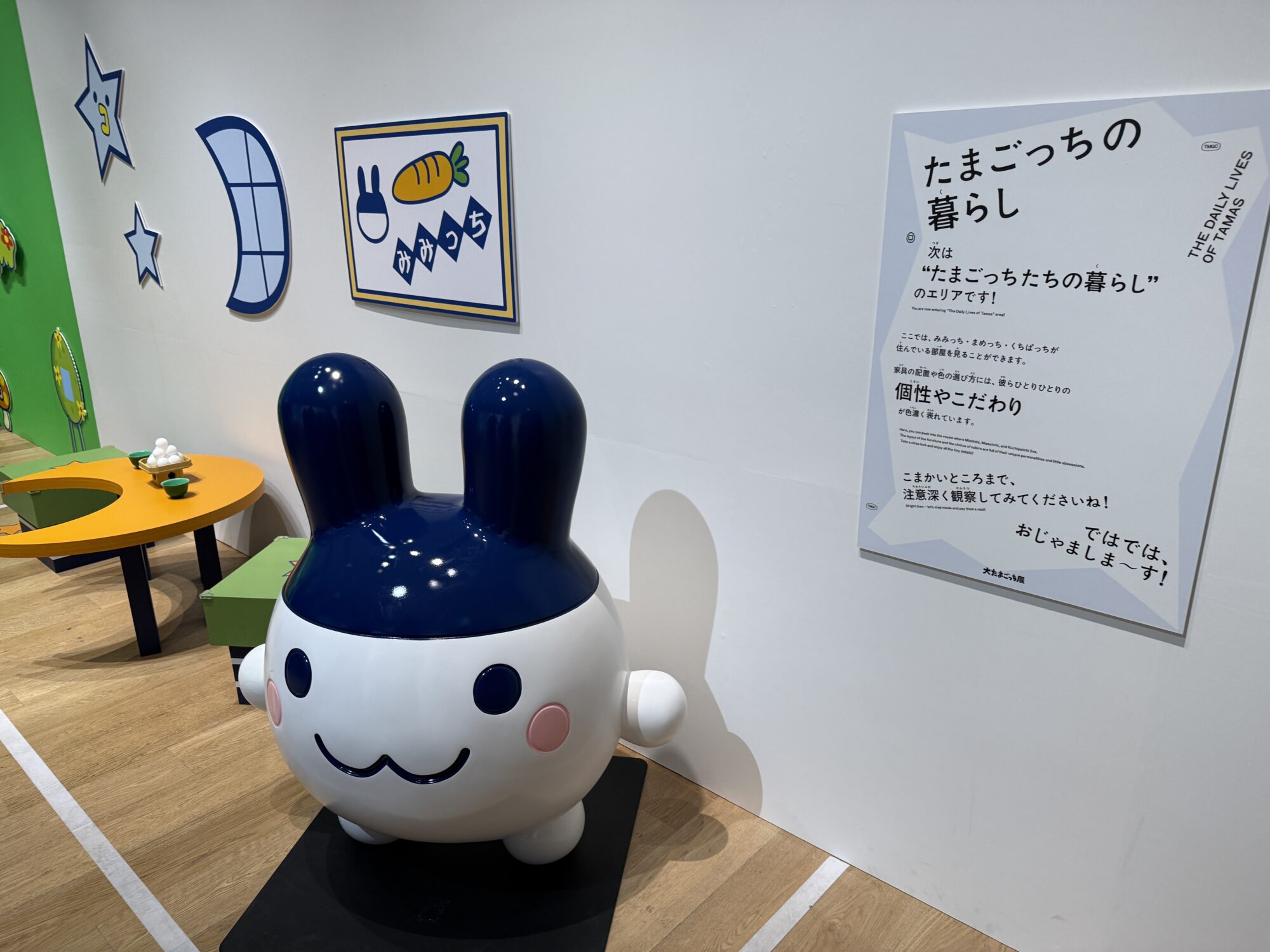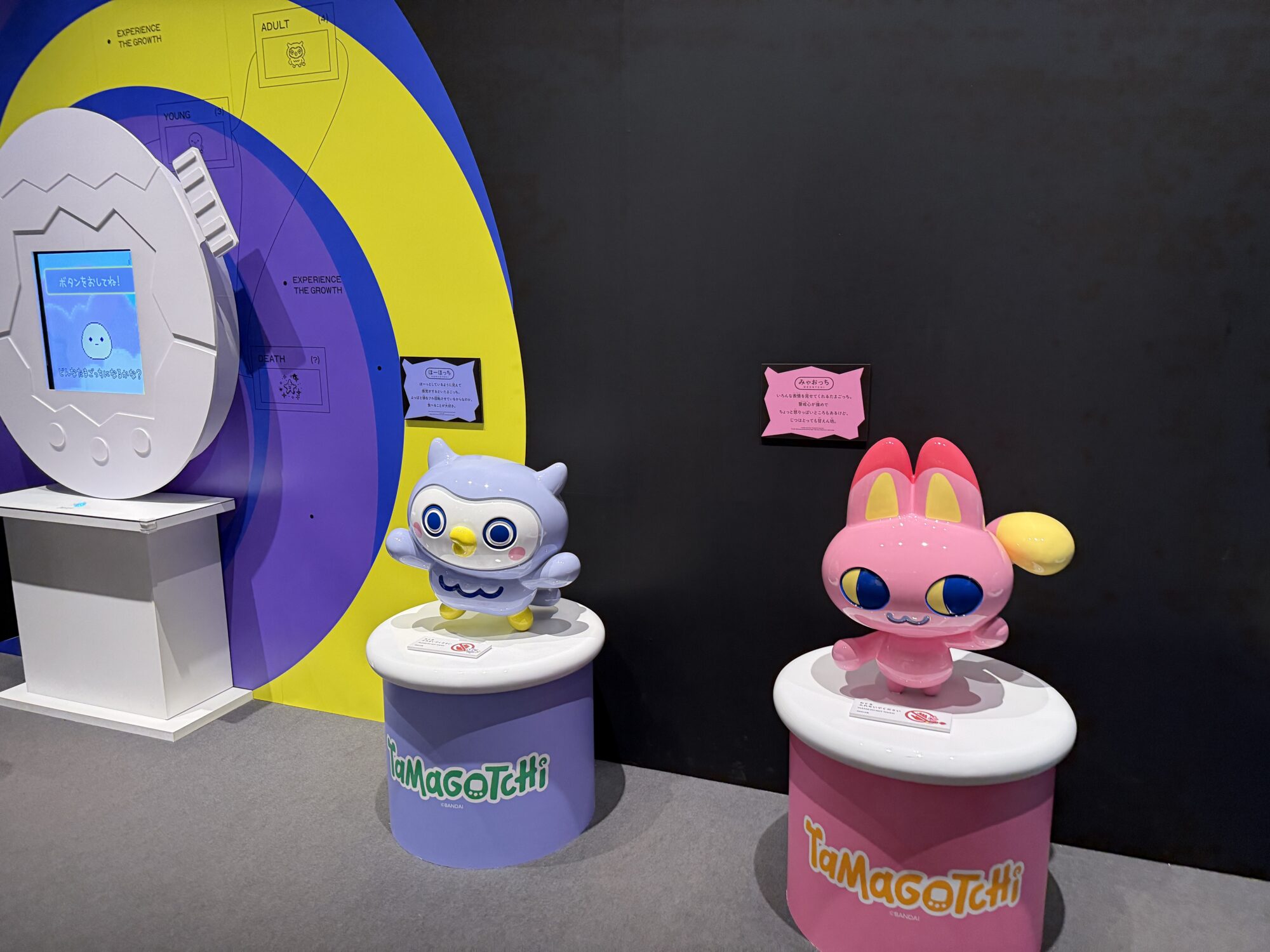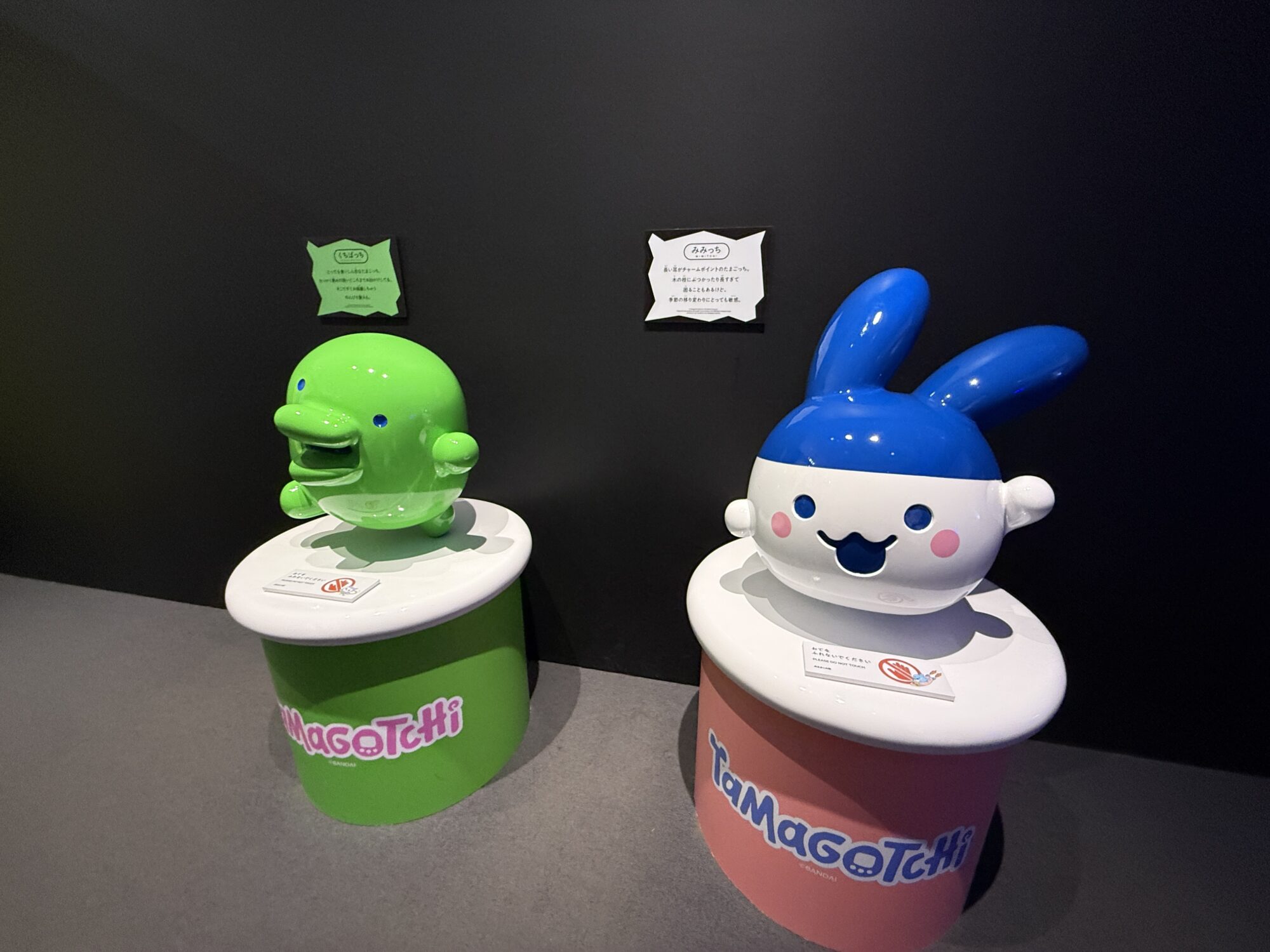 また、少しビジュアルの異なるミミッチやクチパッチのモニュメントもあり、こちらは「たまごっちパラダイス」のイラストタッチで描かれていて、より現代風のデザインになっています。これもまた違った魅力があり、印象に残りました。