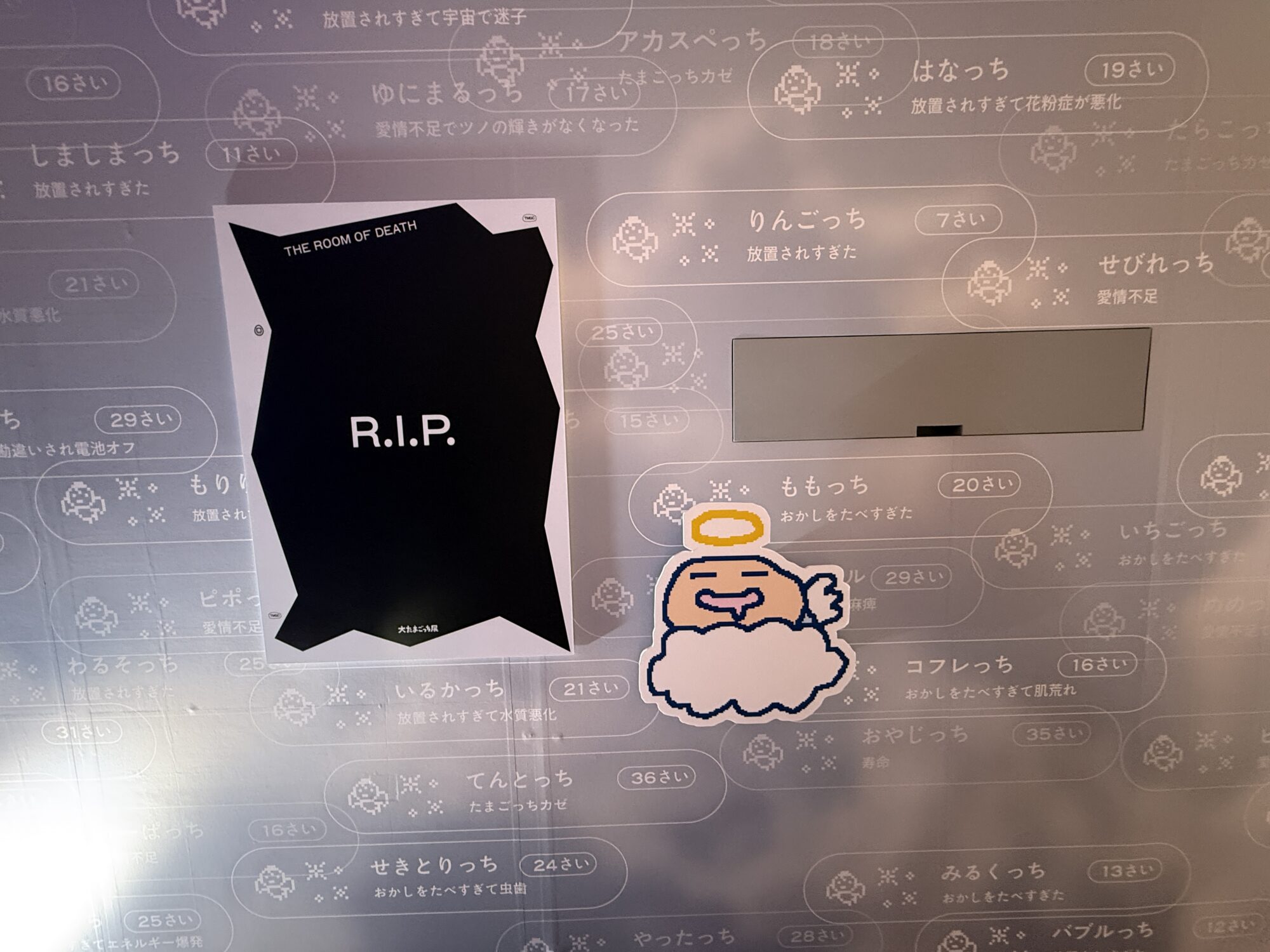 つまり、先ほどの「放置されていたたまごっちたち」の描写は、ここへの伏線だったということが分かります。さらに、大きなポスターには「RIP」「安らかに眠れ」といったメッセージが掲げられており、ここで一度、たまごっちの物語は区切りを迎えます。
