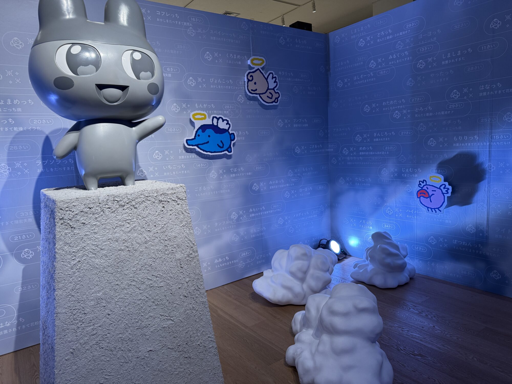 その先を抜けると、天使になってしまったたまごっちたちと、それを象徴するかのような、まめっちの銅像のような雰囲気のオブジェが置かれたゾーンに入ります。