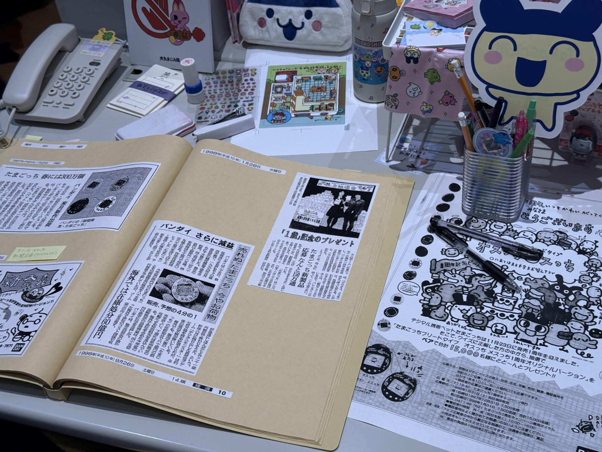 他にも、まるで小学校の職員室の机のような展示があり、その上には没収された設定のたまごっちグッズがずらりと並べられています。たまごっちのアニメなどでよくある、「学校に持って行って先生に見つかり、職員室で保管されるが、先生が代わりに育ててハマってしまう」というエピソードを思い出させる展示で、このあたりも世界観とリンクしているのかもしれません。