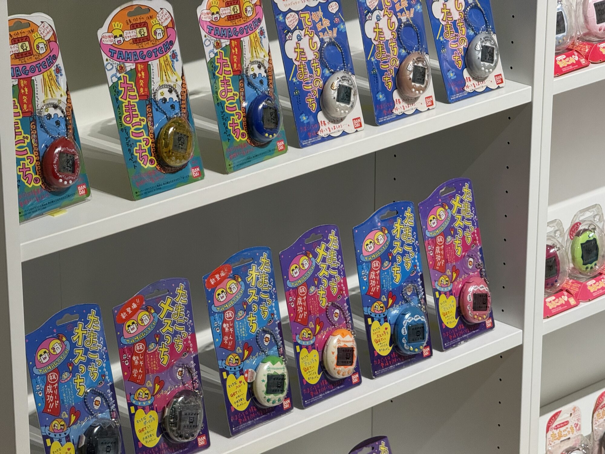 私は1989年生まれなのですが、一番左に並んでいる初代に近いたまごっちのパッケージには、なんとなく見覚えがあり、強い懐かしさを感じました。当時はまだ5〜8歳くらいで、実際に遊んだ記憶はほとんどなく、かなりうろ覚えではありますが、あの特徴的なビビッドな色合いだけは、なぜか脳の片隅に残っています。