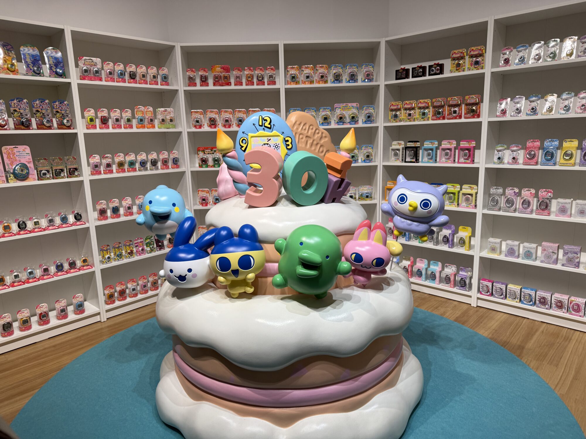 キャラクターたちがケーキの上に並び、踊っているような演出になっており、その背景には、過去30年間の新品デッドストックのたまごっちが何百個もずらりと陳列されています。これは本当に圧巻で、思わず足を止めて見入ってしまう光景です。