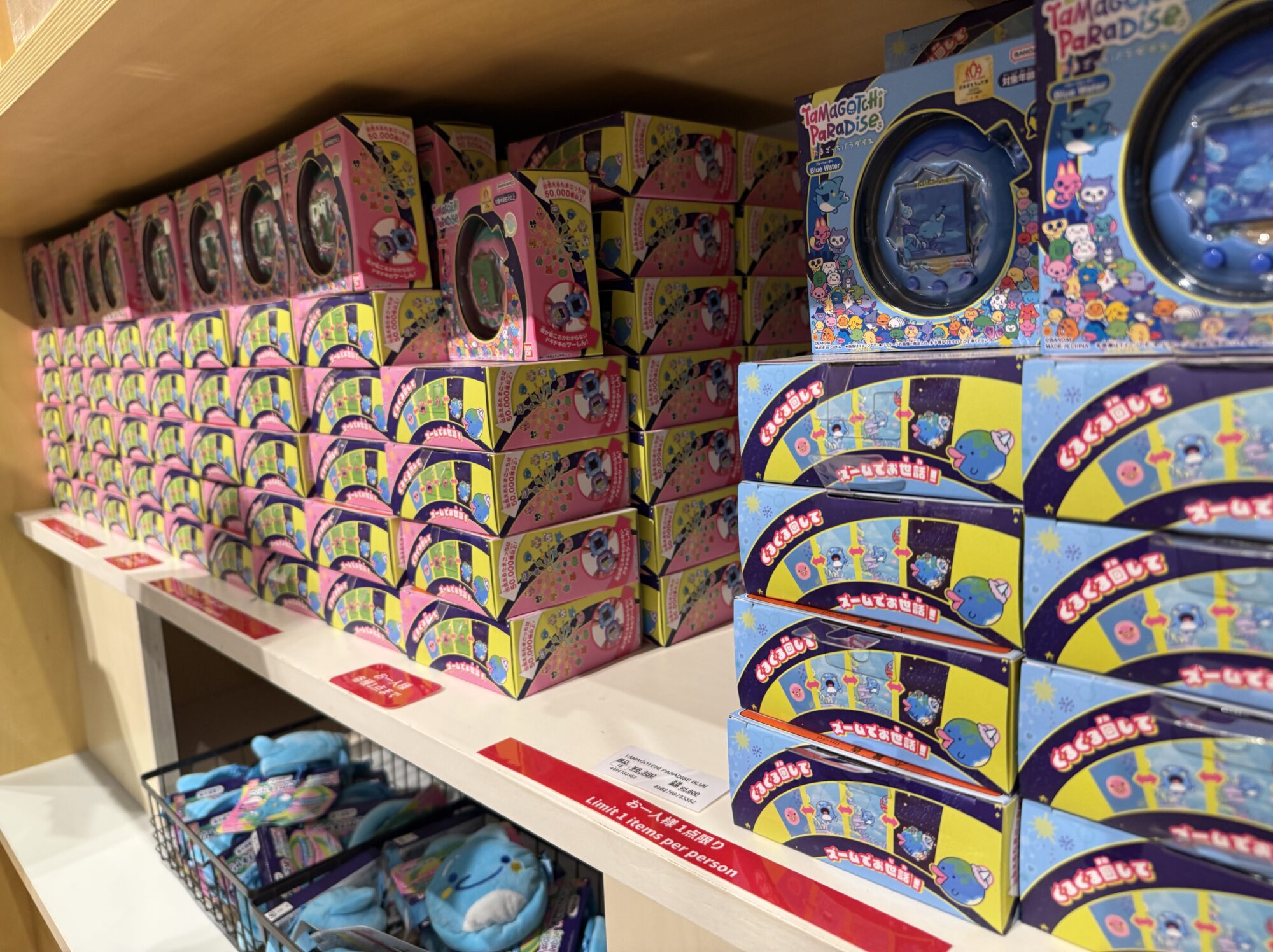 そんな中で驚いたのが、現在では在庫完売で入手困難となっているたまごっちパラダイスが、なんと2色とも在庫ありで販売されていたことです。写真の通り、何百個も積まれており、しかも定価で購入可能でした。これは事前に告知されていないサプライズで、持っていない状態でこのイベントに来た人にとっては、まさに最高のタイミングだと思います。