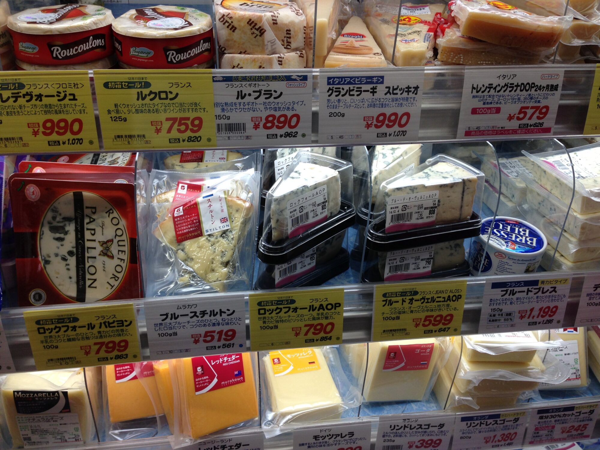また、チェダーチーズ、パルメザンチーズ、ゴーダチーズなどのナチュラルチーズ、さらに都心に近づくと白カビチーズをホールや大きめカットで販売するスーパーも増えます。